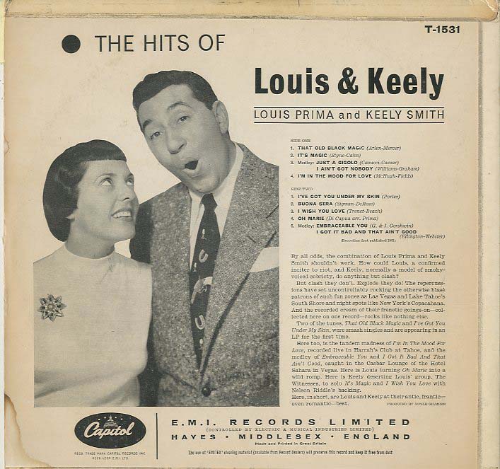 Discographie von Louis Prima & Keely Smith![]() Capitol T 1531 Louis Prima & Keely Smith The Hits of Louis and Keely Eintrag bei DISCOGS (extern) UK (1961), LP, Easy Listening Aufnahme: Mono Zustand: m- / vg+ u.a. That Old Black Magic / Just a Gigolo / I AIn´t Got Nobody, Buena Sera, I´ve Got You Under My Skin Diese Platte ist Bestandteil meiner Top 100. Nicht verkäuflich. | ![]() Coveransicht: Louis Prima & Keely Smith - The Hits of Louis and Keely ![]()
