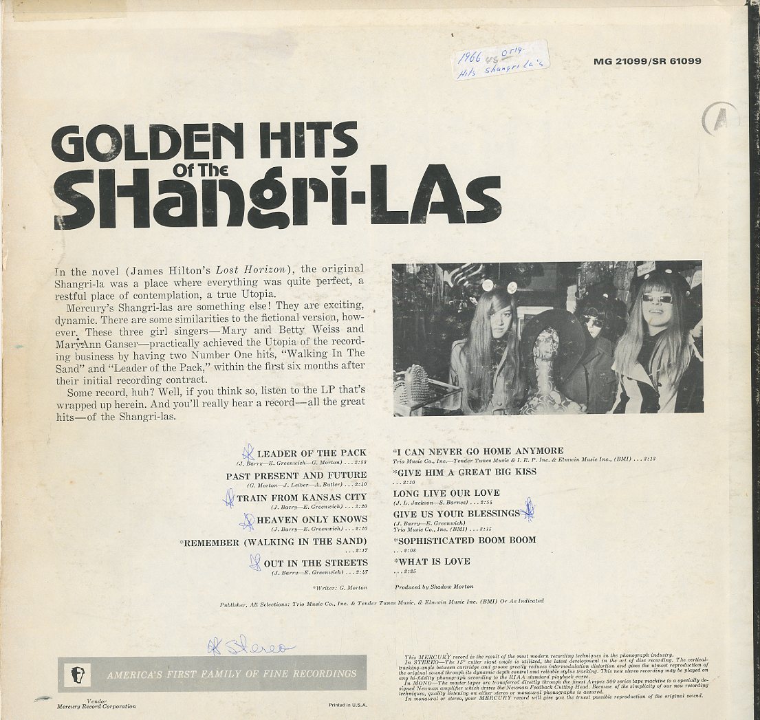 Discographie von The Shangri-Las![]() Mercury MG 21099 The Shangri-Las Golden Hits Of the Shangri-Las Eintrag bei DISCOGS (extern) US 1966, LP, US-Rock Aufnahme: Mono Zustand: vg / vg+ mit Leader of the Pack, Past Present And Future; Heaven Only Knows; I Can Never Go Home Anymore; Give Him A Great Big Kiss u.a.m. Diese Platte ist zur Zeit vergriffen. | ![]() Coveransicht: The Shangri-Las - Golden Hits Of the Shangri-Las ![]()