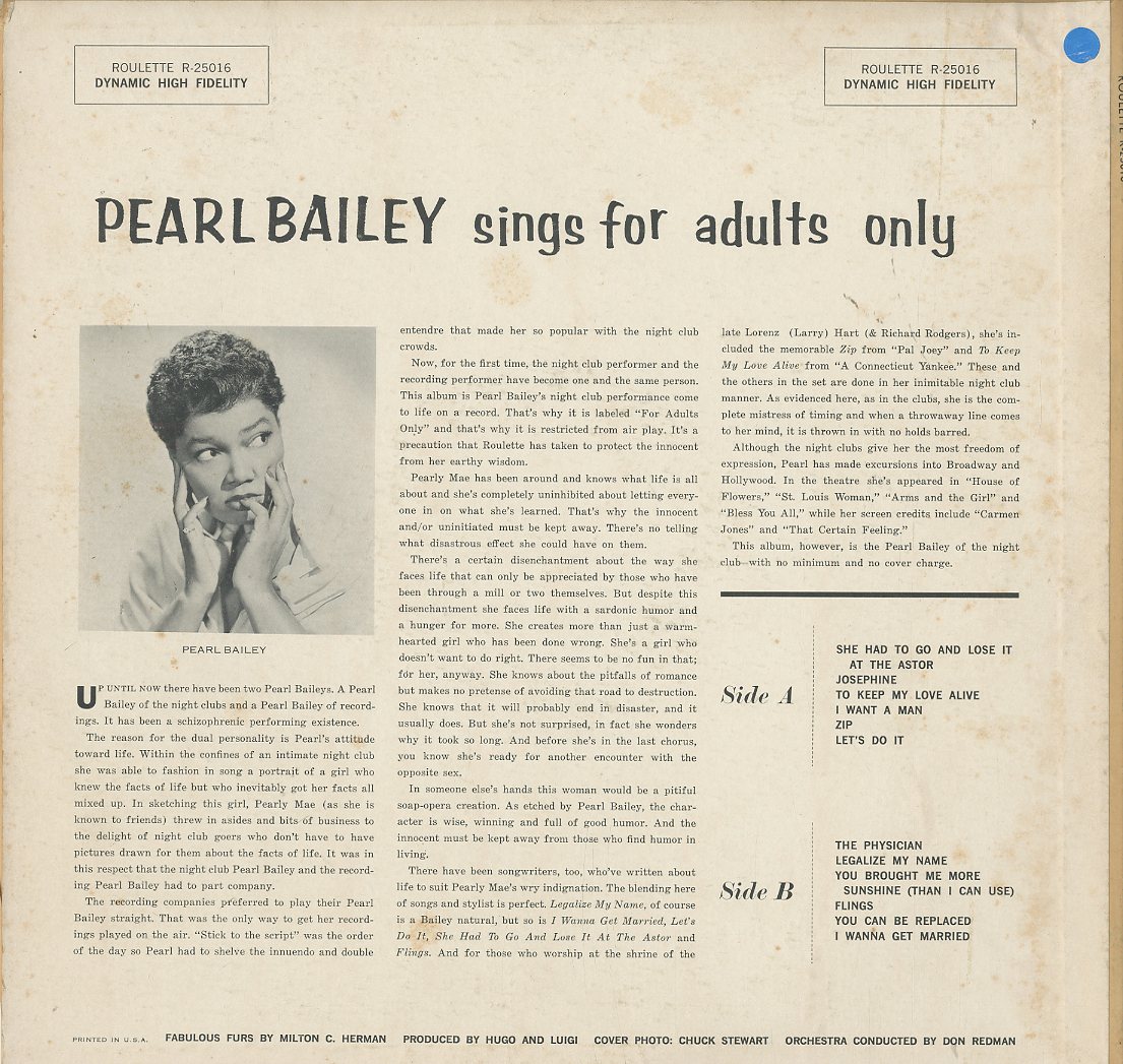 | Discographie von Pearl Bailey Roulette R 25016 Pearl Bailey Sings For Adults Only Eintrag bei DISCOGS (extern) US 1959, LP, Easy Listening Aufnahme: Mono Zustand: vg / vg mit I Want A Man, Let´s Do It, I Wanna Get Married u.a.m. ("Restricted from air play") Diese Platte ist zur Zeit vergriffen. | ![]() Coveransicht: Pearl Bailey - Sings For Adults Only ![]()