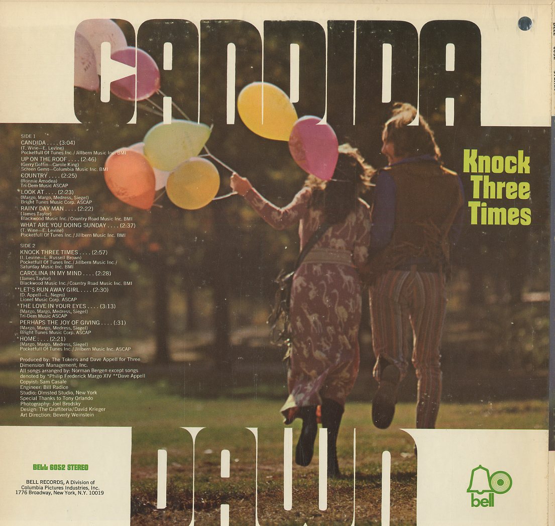 Discographie von Dawn (feat. Tony Orlando)![]() Bell BELL 6052 Dawn (feat. Tony Orlando) Candida Eintrag bei DISCOGS (extern) US 1970, LP, Pop/Rock Aufnahme: Stereo Zustand: m- / mint- sowie Knock Three Times, Up On The Roof, What Are You Doing Sunday, Carolina In My Mind, The Love In Your Eyes Diese Platte ist zur Zeit vergriffen. | ![]() Coveransicht: Dawn (feat. Tony Orlando) - Candida ![]()