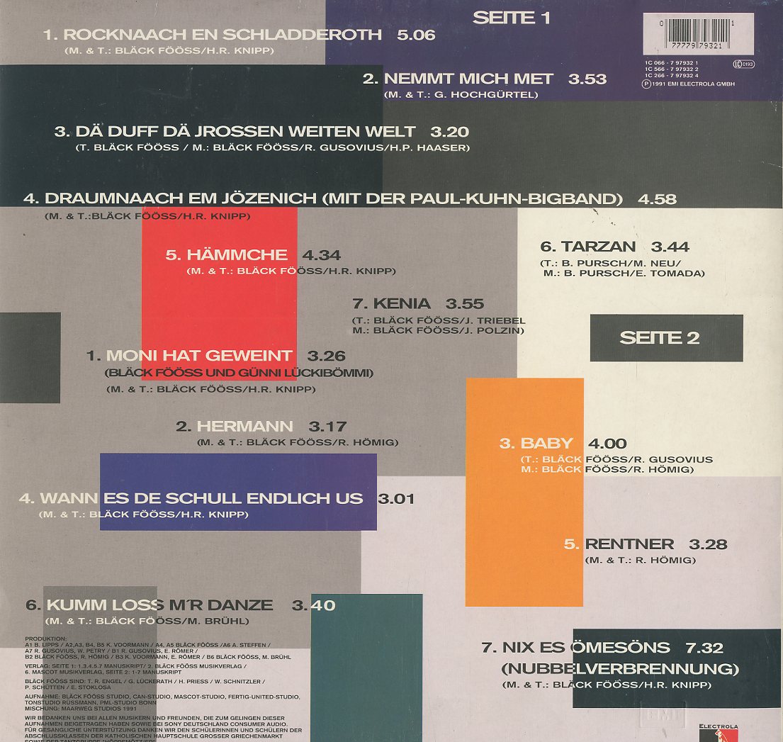 | Discographie von Bläck Fööss Electrola 1 C 066 - 7 97932 1 Bläck Fööss Nix es ömesöns Eintrag bei DISCOGS (extern) D 1991, LP, Deutsche Oldies Aufnahme: Stereo Zustand: m- /. vg++ Texte auf Beiblatt Preis in Euro: 5,00 € Verfügbarkeitsanfrage | ![]() Coveransicht: Bläck Fööss - Nix es ömesöns ![]()