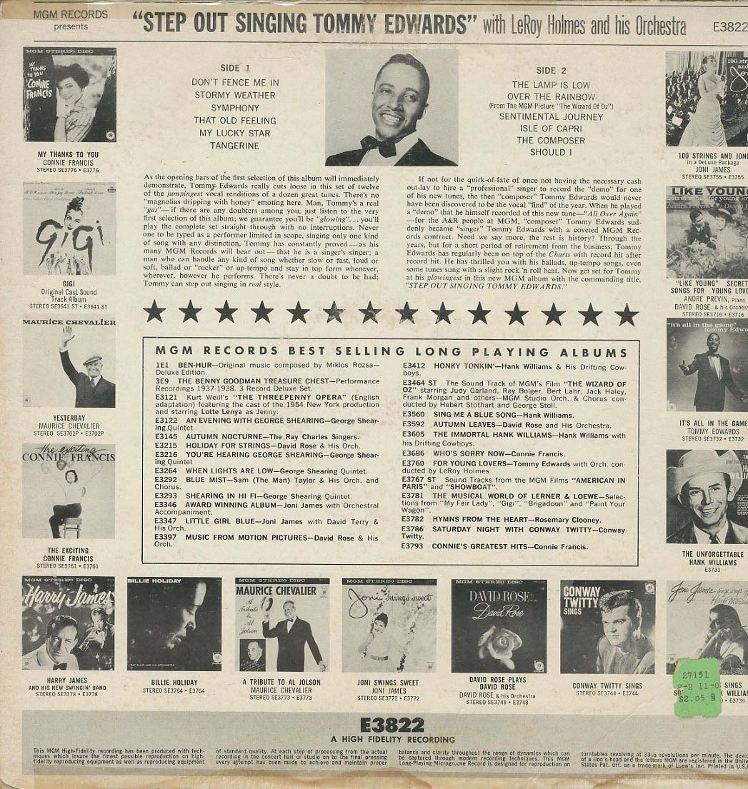 Discographie von Tommy Edwards![]() MGM E 3822 Tommy Edwards Step Out Singing Eintrag bei DISCOGS (extern) US 1960, LP, Easy Listening Aufnahme: Mono Zustand: vg+ / Cover vg mit Dont Fence Me In, Over the Rainbow, Sentimental Journey u.a. Preis in Euro: 4,00 € Verfügbarkeitsanfrage | ![]() Coveransicht: Tommy Edwards - Step Out Singing ![]()