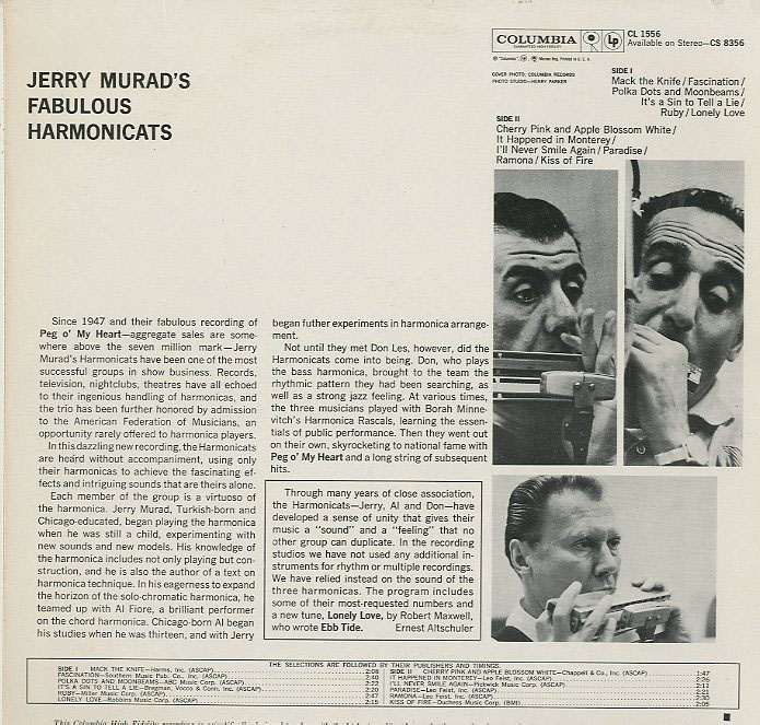 Discographie von Jerry Murad´s Harmonicats![]() Columbia CL 1556 Jerry Murad´s Harmonicats Cherry Pink And Apple Blossom White Eintrag bei DISCOGS (extern) US 1960, LP, Instrumental Aufnahme: Mono Zustand: vg bis vg+/ m- sowie Ramona, Mack The Knife u.a.m. u.a.m. Preis in Euro: 4,50 € Verfügbarkeitsanfrage | Coveransicht: Jerry Murad´s Harmonicats - Cherry Pink And Apple Blossom White ![]()