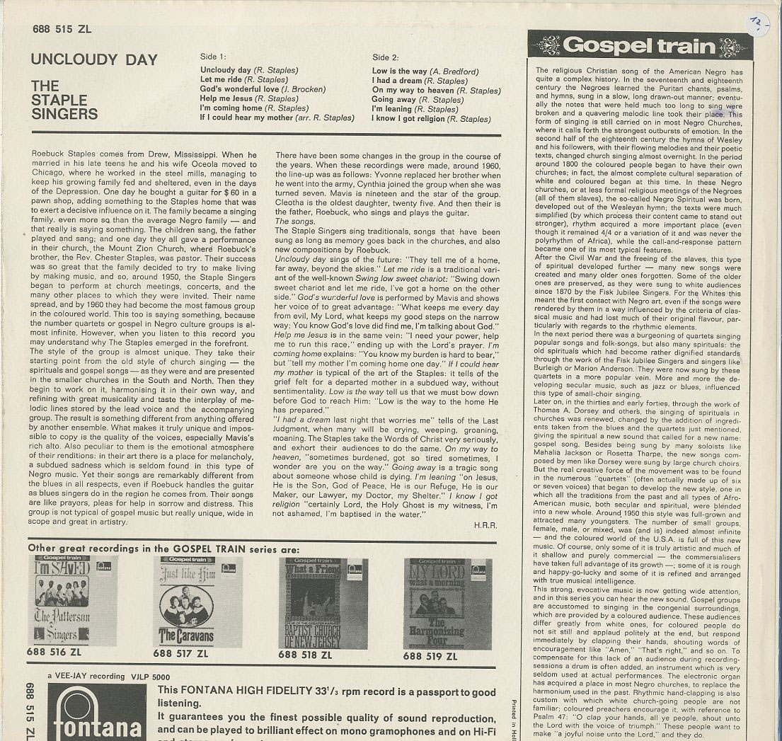 Discographie von Staple Singers![]() Fontana 688 515 ZL Staple Singers Uncloudy Day Review der Schallplatte (extern) Eintrag bei DISCOGS (extern) NL , LP, R&B/Soul/Blues Aufnahme: Mono Zustand: m- / vg++ sowie Help Me Jesus, Im Coming Home, I Had A Dream u.a. Diese Platte ist zur Zeit vergriffen. | ![]() Coveransicht: Staple Singers - Uncloudy Day ![]()