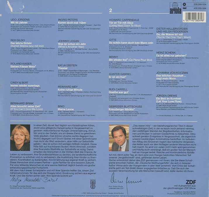 Discographie von Benefiz-LPs![]() Ariola 208 269-664 Benefiz-LPs Hans-Jürgen Bäumler präsentiert: DAS WAREN HITS (Mit Originalaufnahmen aus der gleichnamigen Show des ZDF) D 1987, LP, Deutsche Oldies Aufnahme: Stereo Zustand: m- mit Gitte, Rex Gildo, Ingrid Peters, Katja Ebstein Bino, Gebr. Blattschuss, Johanna von Koczian, Heinz Schenk, Dieter Hallervorden und Helga Feddersen, Johnny Logan (Deutsche Fassung von What´s Another Year) u.a.m. Diese Platte ist noch nicht ausgezeichnet. Stellen Sie einePreisanfrage. | ![]() Coveransicht: Benefiz-LPs - Hans-Jürgen Bäumler präsentiert: DAS WAREN HITS (Mit Originalaufnahmen aus der gleichnamigen Show des ZDF) ![]()