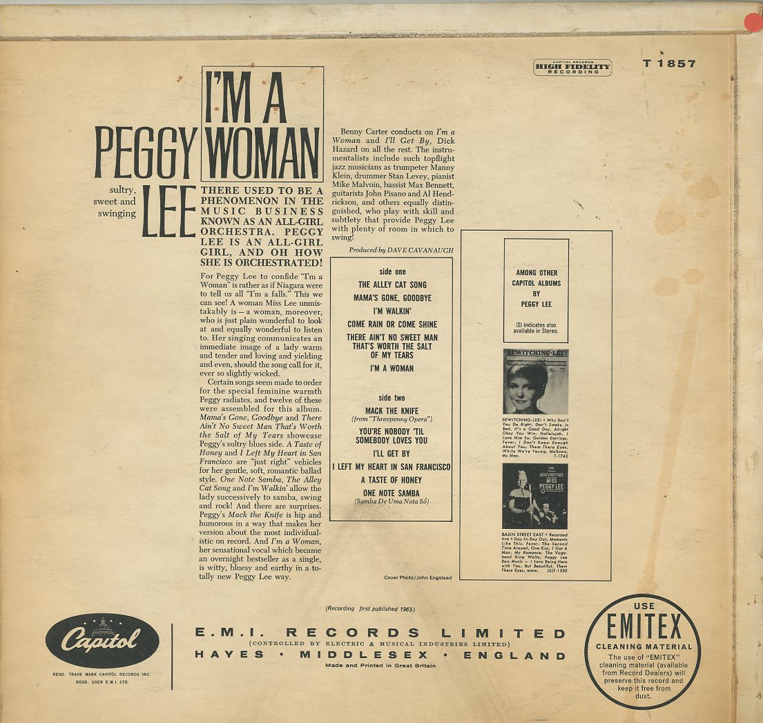Discographie von Peggy Lee![]() Capitol Records T 1857 Peggy Lee I Am A Woman Eintrag bei DISCOGS (extern) UK 1963, LP, Easy Listening Aufnahme: Mono Zustand: vg+ / Cover vg (Rückseite etwas angeschmutzt bzw. vergilbt) sowie The Alley Cat Song, Mack the Knife, A Taste Of Honey, One Note Samba u.a. Preis in Euro: 5,00 € Verfügbarkeitsanfrage | ![]() Coveransicht: Peggy Lee - I Am A Woman ![]()