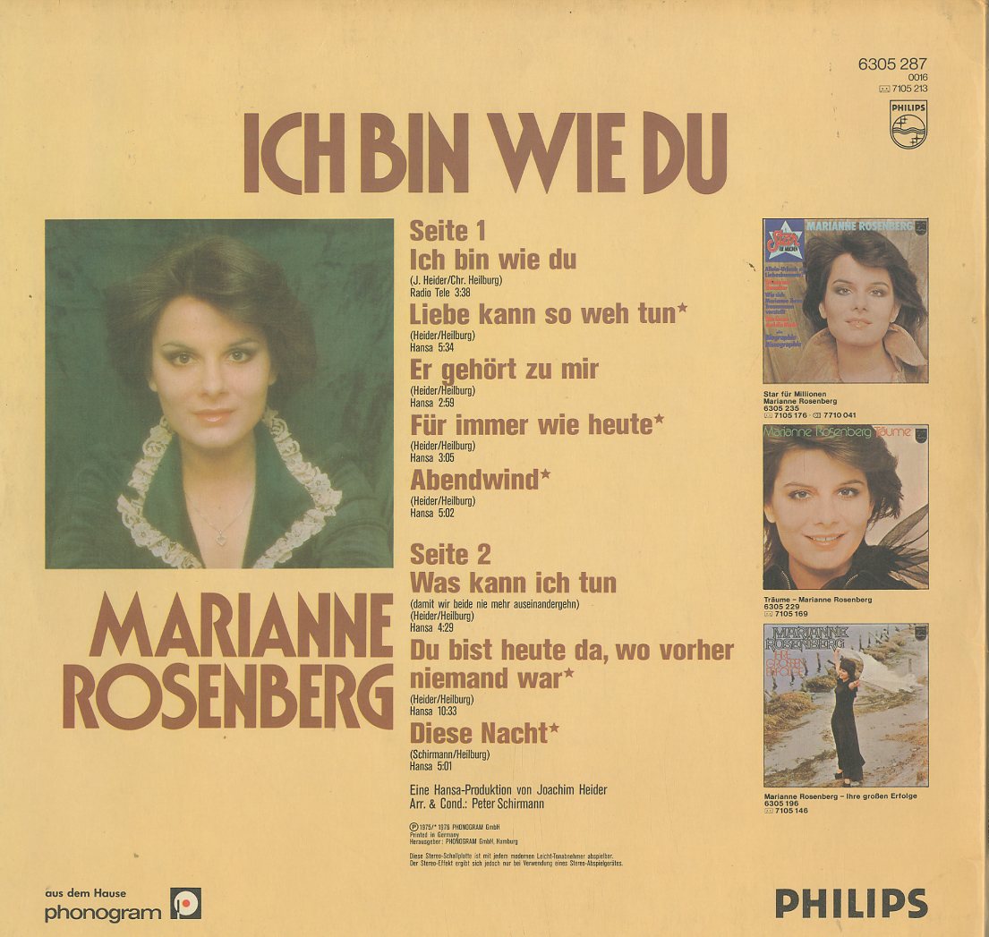 Discographie von Marianne Rosenberg![]() Philips 6305 287 Marianne Rosenberg Ich bin wie du Eintrag bei DISCOGS (extern) D 1976, LP, Deutsche Oldies Aufnahme: Stereo Zustand: vg+ / vg+ sowie Er gehört zu mir, Für immer wie heute Preis in Euro: 5,00 € Verfügbarkeitsanfrage | ![]() Coveransicht: Marianne Rosenberg - Ich bin wie du ![]()