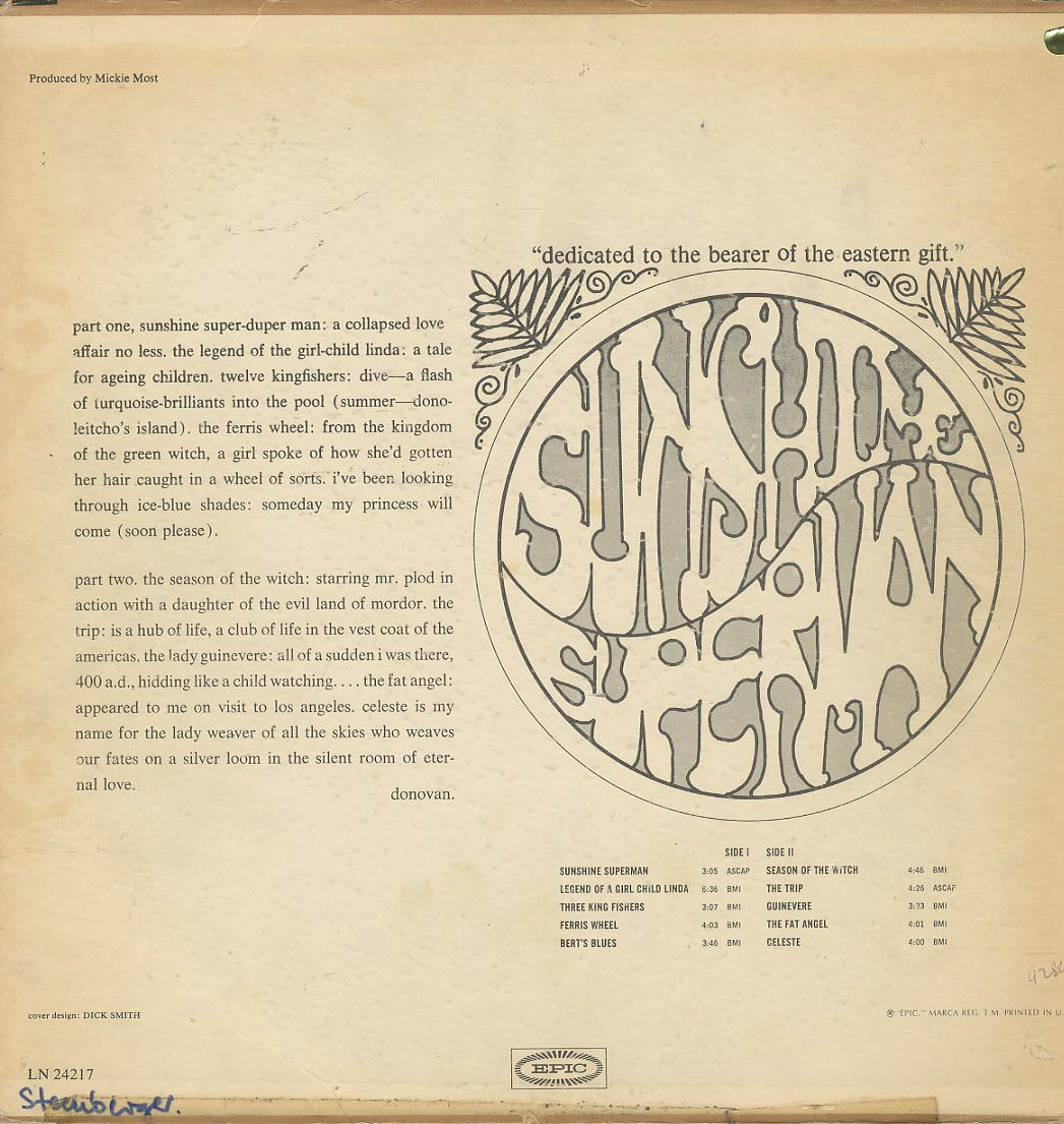 Discographie von Donovan![]() Epic LN 24217 Donovan Sunshine Superman Review der Schallplatte (extern) Eintrag bei DISCOGS (extern) US 1966, LP, C&W/Folk Aufnahme: Mono Zustand: vg+ / Cover vg (+) (Ringwaear)) sowie Season Of the Witch u.a.m. Diese Platte ist zur Zeit vergriffen. | ![]() Coveransicht: Donovan - Sunshine Superman ![]()