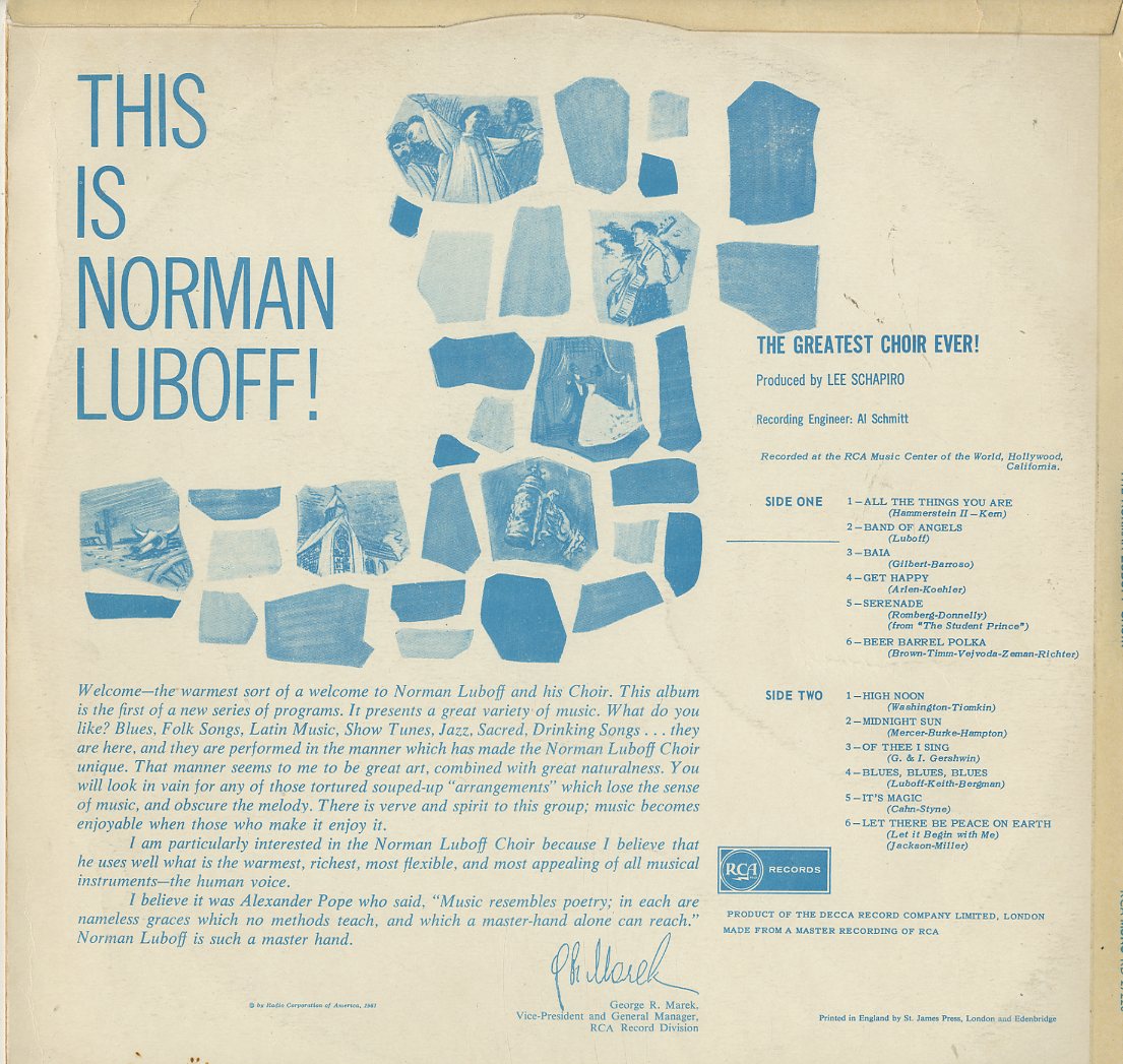 Discographie von Norman Luboff Chor![]() RCA RD 27220 Norman Luboff Chor This Is Norman Luboff Review der Schallplatte (extern) Eintrag bei DISCOGS (extern) UK 1961, LP, C&W/Folk Aufnahme: Mono Zustand: vg+ / vg+ mit Get Happy, High Noon, Its Magic, Let There Be Peace On Earth u.a.m. Preis in Euro: 4,50 € Verfügbarkeitsanfrage | ![]() Coveransicht: Norman Luboff Chor - This Is Norman Luboff ![]()