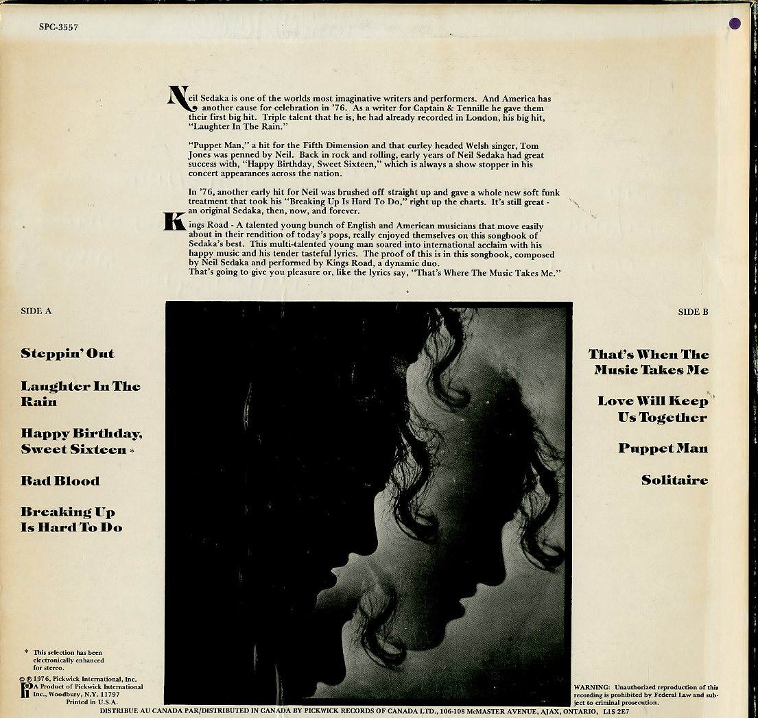 Discographie von Kings Road![]() Pickwick SPC 3557 Kings Road Neil Sedaka Song Book Eintrag bei DISCOGS (extern) CA 1976, LP, Pop/Rock Aufnahme: El. Stereo Zustand: vg+ / vg+ mit Thats When The Music Takes Me, Love Will Keep Us Together u.a. Preis in Euro: 4,50 € Verfügbarkeitsanfrage | ![]() Coveransicht: Kings Road - Neil Sedaka Song Book ![]()