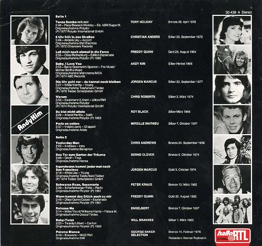 Discographie von Löwenstars (RTL) Hallo RTL30 439 4 Löwenstars (RTL) Die Superserie der Löwenstars 1959 - 1979 (7 Folge) D , LP, Deutsche Oldies Aufnahme: Stereo Zustand: m- 20 Gewinner,mit Christian Anders, Tony Holiday, Andy Kim, Chris Andrews, Peter Kraus, Will Brandes u.a.m. Preis in Euro: 6 € Verfügbarkeitsanfrage | ![]() Coveransicht: Löwenstars (RTL) - Die Superserie der Löwenstars 1959 - 1979 (7 Folge) ![]()