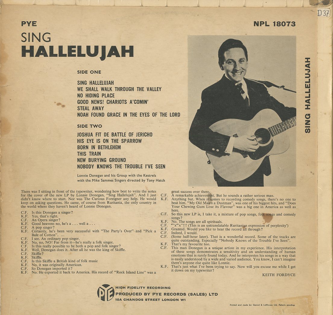 Discographie von Lonnie Donegan![]() Pye NPL 18073 Lonnie Donegan Sing Hallelujah Eintrag bei DISCOGS (extern) UK 1962, LP, C&W/Folk Aufnahme: Mono Zustand: vg (+) / Cover vergilbt, Laminierung gewellt und andere Spirituals mit The Kestrels und Mike Sammes Singers Diese Platte ist Bestandteil meiner Top 100. Nicht verkäuflich. | ![]() Coveransicht: Lonnie Donegan - Sing Hallelujah ![]()