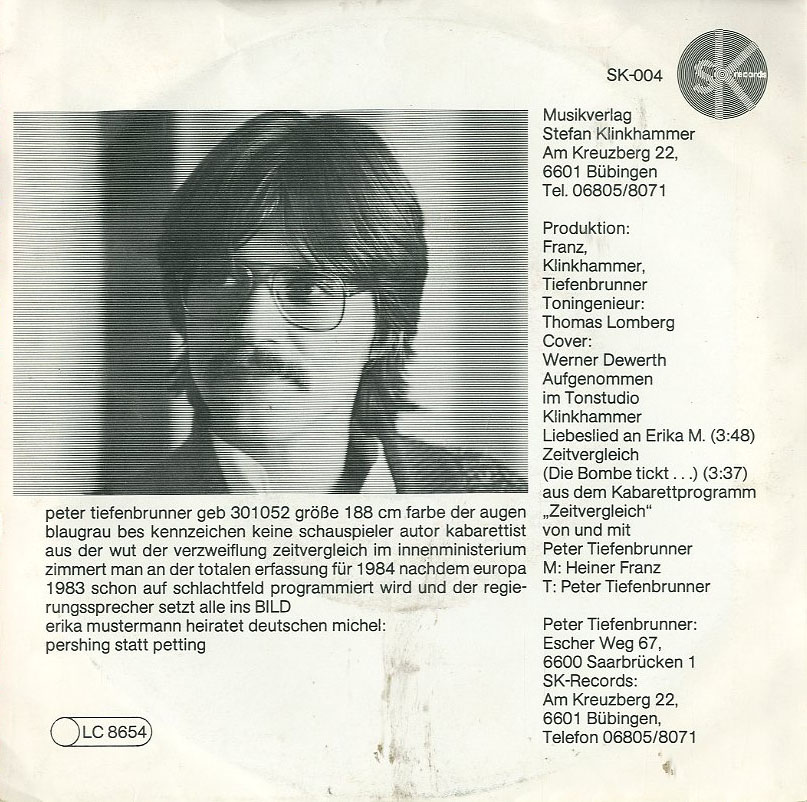 SKRecords SK 004 Peter Tiefenbrunner Liebeslied an Erika M*. /Zeitvergleich (Die Bombe tickt ... )** D 1984, Single, Deutsche Oldies Zustand: m- / vg+++ Texte auf Beiblatt * Satire zum neuen Personalausweis ** Aus dem gleichnamigen Kabarettprogramm Bei Ebay eingestellt Preis in Euro: 3,00 € Verfügbarkeitsanfrage | ![]() Coveransicht: Peter Tiefenbrunner - Liebeslied an Erika M*. /Zeitvergleich (Die Bombe tickt ... )** ![]()