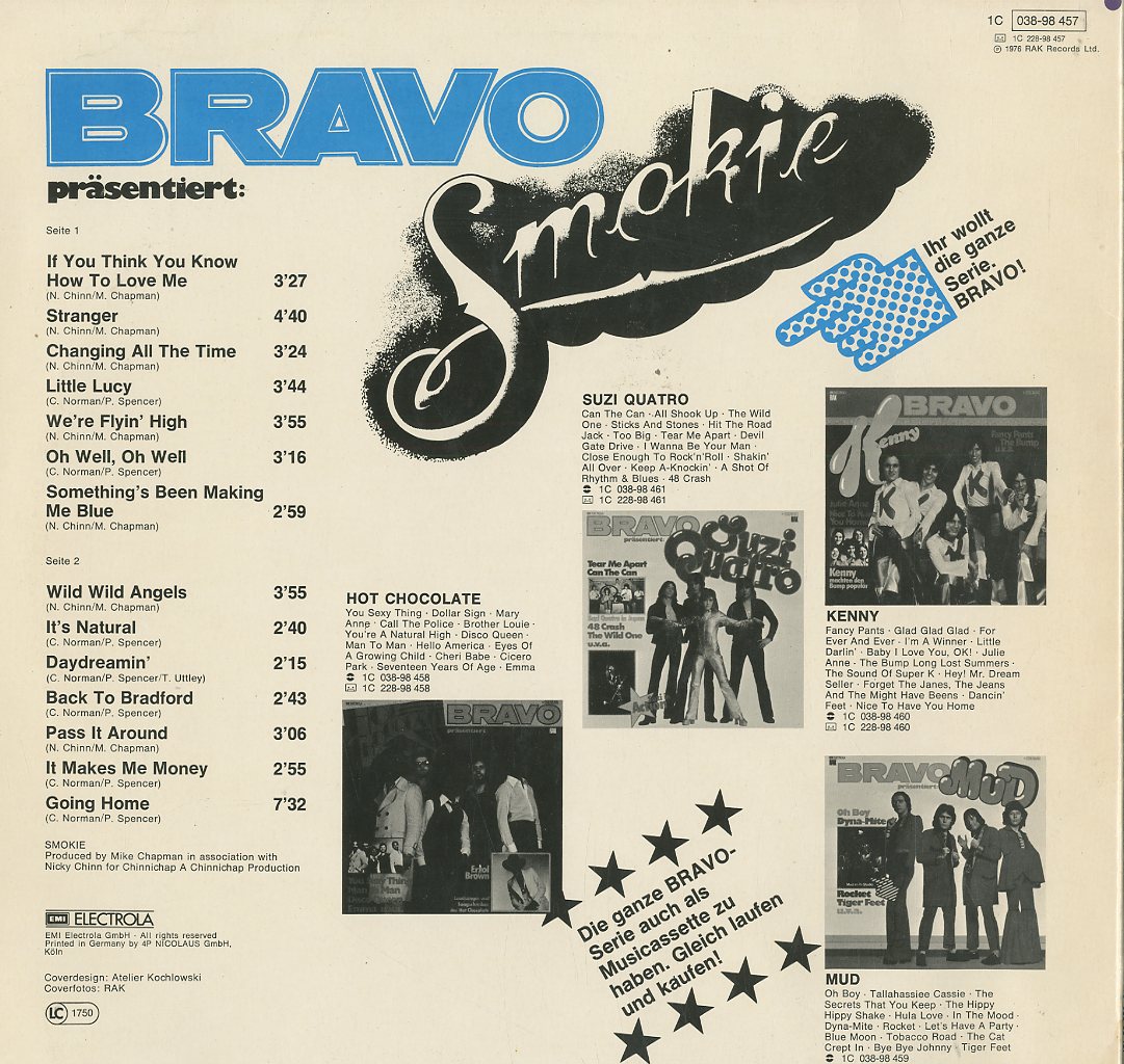 Discographie von Smokie![]() RAK 1 C 038-98 457 Smokie Bravo präsentiert Smokie Eintrag bei DISCOGS (extern) D 1976, LP, Pop/Rock Aufnahme: Stereo Zustand: vg+ bis m- / vg+ (Kl. Aufkleber, untere Kante sauber geklebt) mit If You Think You Know How To Love Me, Something´s Been Making Me Blue, Wild Wild Angels u.a.m. Preis in Euro: 4,50 € Verfügbarkeitsanfrage | ![]() Coveransicht: Smokie - Bravo präsentiert Smokie ![]()