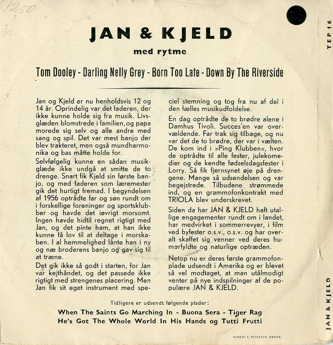 Discographie von Jan & Kjeld Triola TEP 16 Jan & Kjeld Jan & Kjeld Eintrag bei DISCOGS (extern) DK 1959/60, EP, GB-Rock Aufnahme: Mono Zustand: vg+ / Cover g ( beschädigt -> Foto) mit Tom Dooley, Darling Nelly Grey, Born Too Late, Down by the Riverside Preis in Euro: 1,00 € Verfügbarkeitsanfrage | ![]() Coveransicht: Jan & Kjeld - Jan & Kjeld ![]()