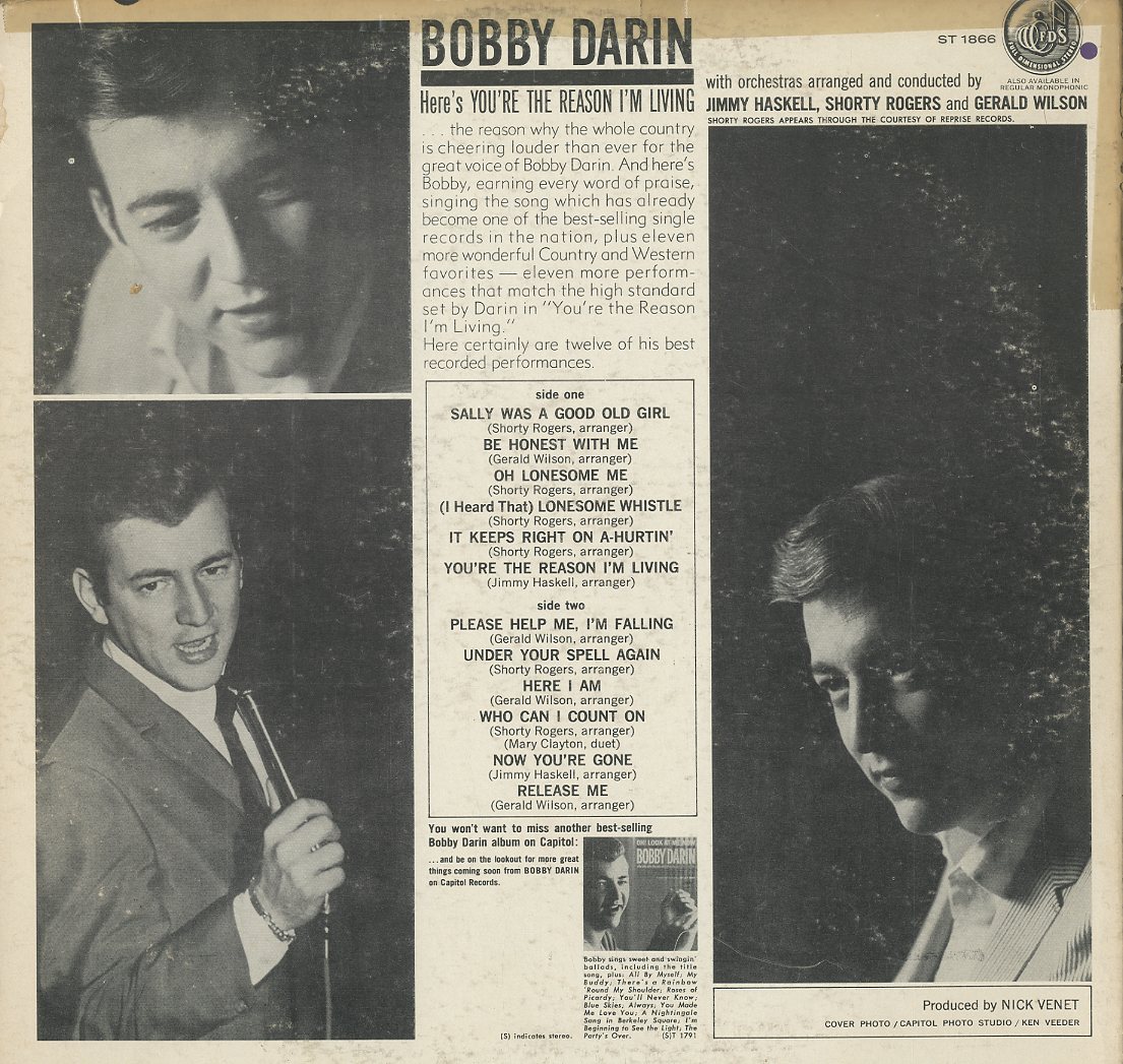 Discographie von Bobby Darin![]() Capitol Rec. T-1866, Cover ST Bobby Darin Youre The Reason Im Living Eintrag bei DISCOGS (extern) US 1963, LP, US-Rock Aufnahme: Stereo Zustand: vg+ / vg sowie Release Me, Please Help Me Im Falling u.a. Mono LP in Stereo-Cover Recorded: Jan. 1963 Date of Release: Feb. 1963 Chart information: Debuted on 3/16/63, peaked at #43 and remained on Billboards LP chart for 15 weeks Preis in Euro: 4,50 € Verfügbarkeitsanfrage | ![]() Coveransicht: Bobby Darin - Youre The Reason Im Living ![]()