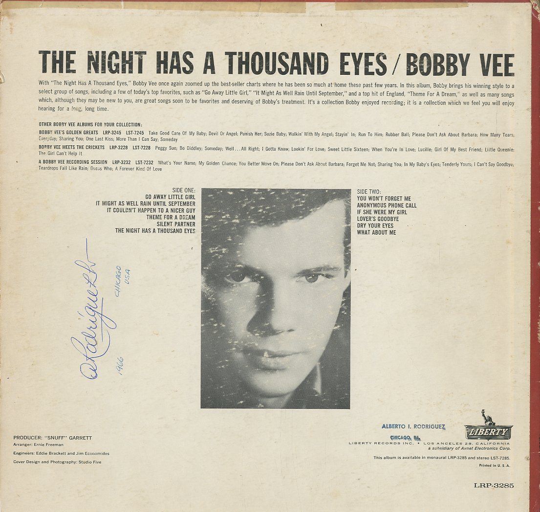 Discographie von Bobby Vee![]() Liberty LRP 3285 Bobby Vee The Night Has A Thousand Eyes Eintrag bei DISCOGS (extern) US 1963, LP, US-Rock Aufnahme: Mono Zustand: vg (-) / vg sowie Go Away Little Girl, Dry Your Eyes, What About Me u.a. Preis in Euro: 2,50 € Verfügbarkeitsanfrage | ![]() Coveransicht: Bobby Vee - The Night Has A Thousand Eyes ![]()