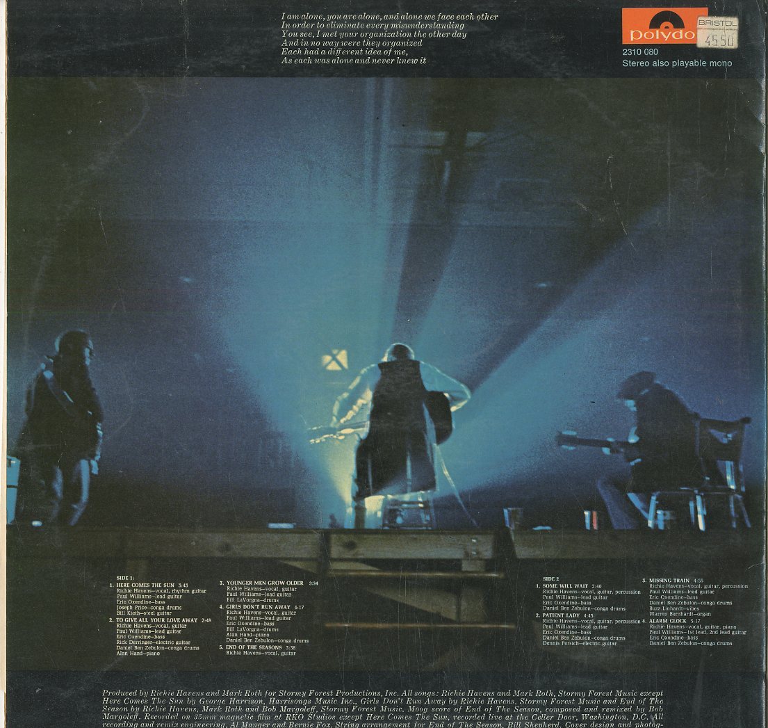 Discographie von Richie Havens![]() Polydor 2310 080 Richie Havens Alarm Clock Eintrag bei DISCOGS (extern) NORW 1971, LP, Pop/Rock Aufnahme: Stereo Zustand: vg+ / vg+ sowie Here Comes The Sun, To Give All Your Love Away u.a.m. "Here Comes The Sun" recorded live at the Cellar Door, Washington, D.C. Preis in Euro: 10,00 € Verfügbarkeitsanfrage | ![]() Coveransicht: Richie Havens - Alarm Clock ![]()