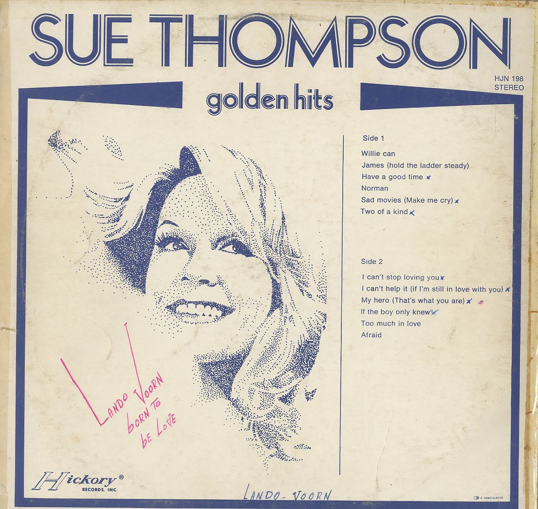 ![]() Hickory HUH 198 / HJN Sue Thompson Golden Hits Eintrag bei DISCOGS (extern) NL 1963, LP, US-Rock Aufnahme: Stereo Zustand: vg+ / vg (Name auf Cover und Label) u.a. Norman, James, Sad Movies, Willie Can Diese Platte ist Bestandteil meiner Top 100. Nicht verkäuflich. | ![]() Coveransicht: Sue Thompson - Golden Hits ![]()