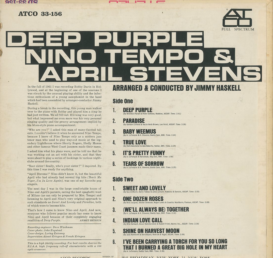 Discographie von Nino Tempo & April Stevens![]() Atco 33-156 Nino Tempo & April Stevens Deep Purple Eintrag bei DISCOGS (extern) US 1963, LP, US-Rock Aufnahme: Mono Zustand: vg+ / vg+ sowie Indian Love Call, We´ll be Together u.a. Diese Platte ist zur Zeit vergriffen. | ![]() Coveransicht: Nino Tempo & April Stevens - Deep Purple ![]()