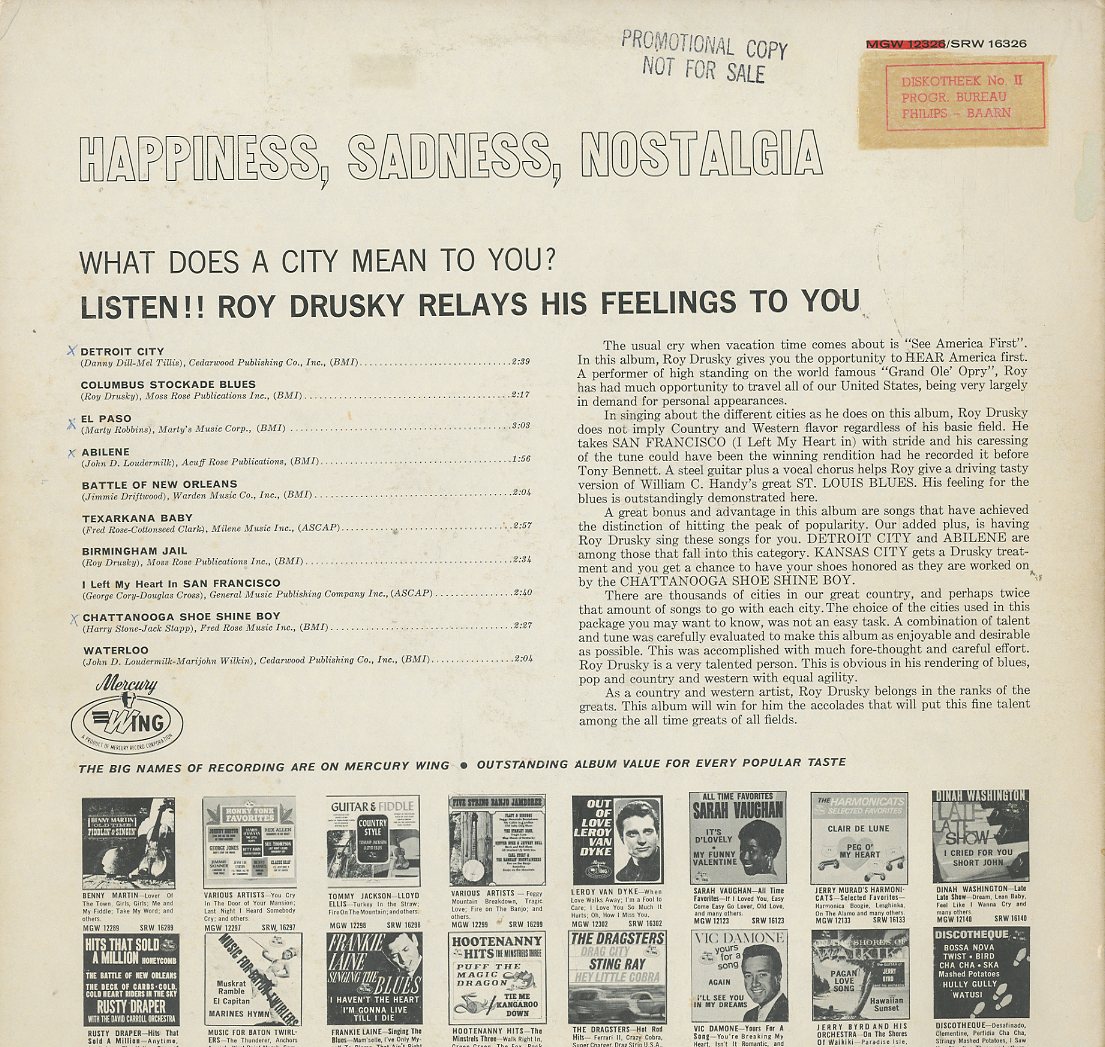 | Discographie von Roy Drusky Mercury Wing Hi-Fi Stereo SRW 16326 Roy Drusky Songs of the Cities Review der Schallplatte (extern) Eintrag bei DISCOGS (extern) US 1966 (Orig. 1964), LP, C&W/Folk Aufnahme: Stereo Zustand: vg+ + / vg++ (Stempel PROMOTIONAL COPY...) mit Detroit City, El Paso, Abilene u.a. Special Edition von Pall Mall als Zugabe St. Louis Blues" and "Kansas City" are removed from this version despite still being mentioned in the liner notes. Preis in Euro: 6,00 € Verfügbarkeitsanfrage | ![]() Coveransicht: Roy Drusky - Songs of the Cities ![]()
