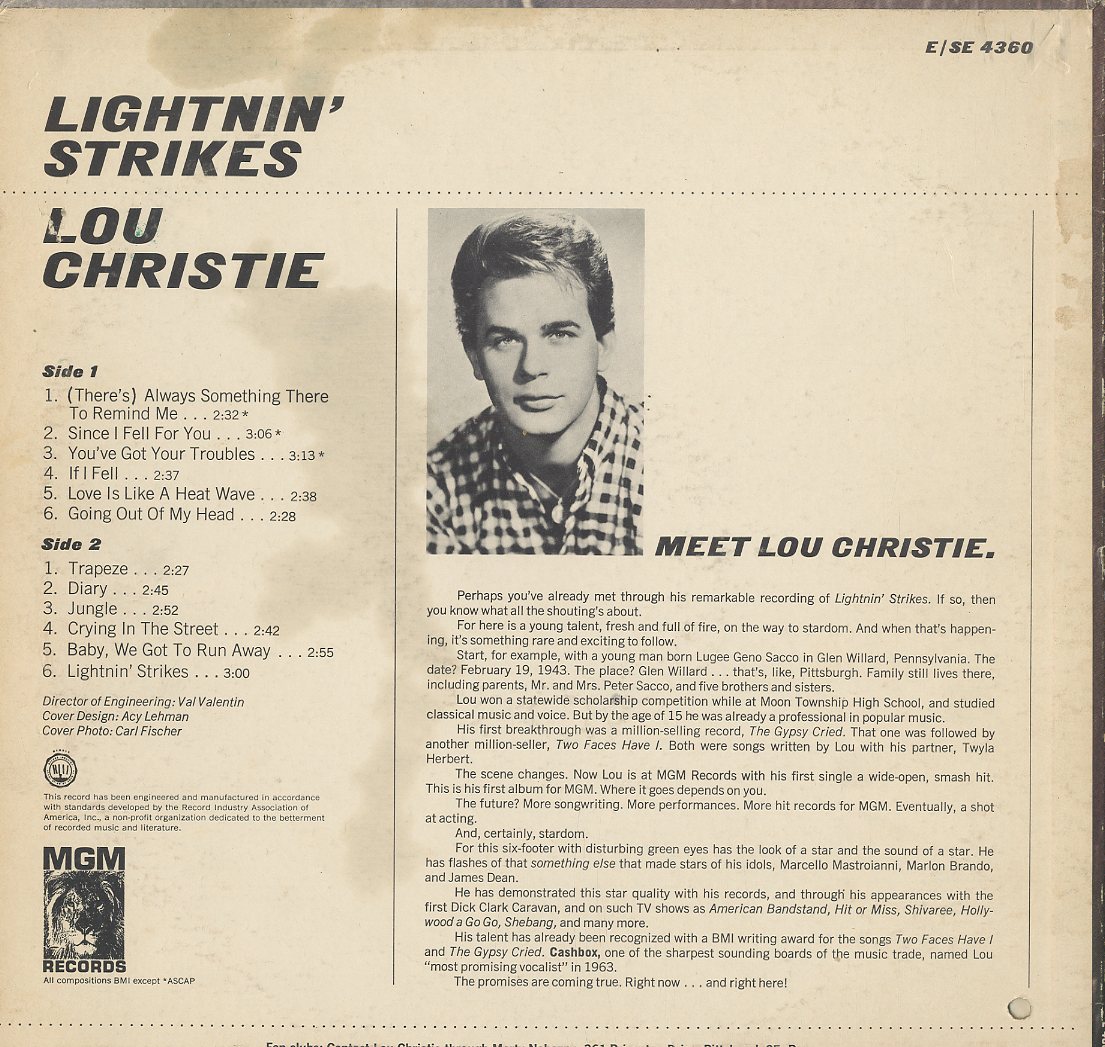 Discographie von Lou Christie![]() MGM E 4360 Lou Christie Lightnin´ Strikes Eintrag bei DISCOGS (extern) US 1965, LP, Pop/Rock Aufnahme: Mono Zustand: vg+ bis m- / vg(+) (cut out - kl. Loch), Kanten teilw. sauber geklebt, in MGM OIS sowie (There´s) Always Something There To Remind Me, You´ve Got Your Troubles; Love is Like A Heatwave; Going Out Of My Head u.a. Platz 103 3/66 lt. Top Lps Preis in Euro: 4,50 € Verfügbarkeitsanfrage | ![]() Coveransicht: Lou Christie - Lightnin´ Strikes ![]()