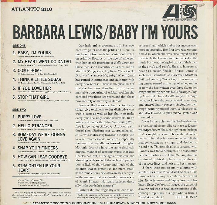 Discographie von Barbara Lewis![]() Atlantic 8110 Barbara Lewis Baby I´m Yours Eintrag bei DISCOGS (extern) US 1965, LP, R&B/Soul/Blues Aufnahme: Mono Zustand: vg+ bis sowie Hello Stranger, Snap Your Fingers u.a. Diese Platte ist Bestandteil meiner Top 100. Nicht verkäuflich. | ![]() Coveransicht: Barbara Lewis - Baby I´m Yours ![]()