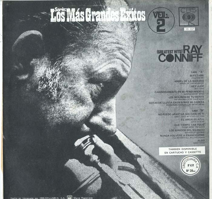 Discographie von Ray Conniff![]() CBS CS 10 137 Ray Conniff Los Mas Grandes Exitos Vol. 2 Review der Schallplatte (extern) VENEZ 1973, LP, Instrumental Aufnahme: Stereo Zustand: vg (+) / Cover vg++ mit Sueltame (Release Me), Hey Jude, El amor Es azul (Love Is Blue), Algo (Something) Diese Platte ist noch nicht ausgezeichnet. Stellen Sie einePreisanfrage. | ![]() Coveransicht: Ray Conniff - Los Mas Grandes Exitos Vol. 2 ![]()