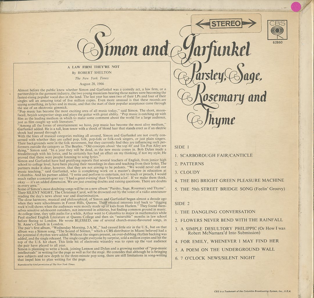 Discographie von Simon & Garfunkel![]() CBS SBPG 62860 Simon & Garfunkel Parsley, Sage, Rosemary & Thyme Review der Schallplatte (extern) Eintrag bei DISCOGS (extern) UK 1966, LP, Pop/Rock Aufnahme: Stereo Zustand: m- / vg++ mit Scarborough Fair / Canticle (Interlude); The 59th Street Bridge Song u.a.m. Diese Platte ist zur Zeit vergriffen. | ![]() Coveransicht: Simon & Garfunkel - Parsley, Sage, Rosemary & Thyme ![]()