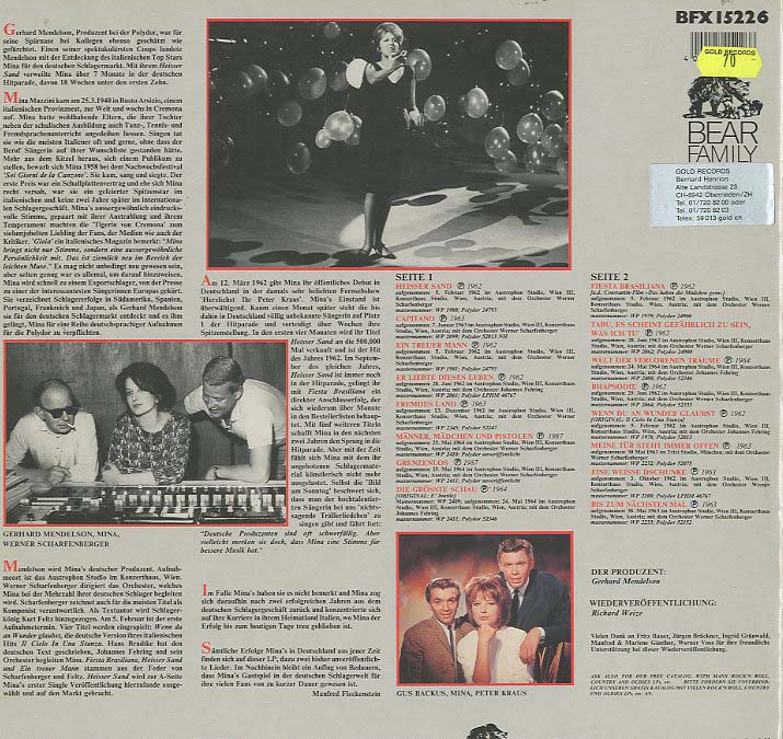 Discographie von Mina![]() Polydor BFX 15226 Mina Heisser Sand Review der Schallplatte (extern) Eintrag bei DISCOGS (extern) D 1987, LP, Deutsche Oldies Aufnahme: Mono Zustand: m- / vg++ sowie Fiesta Brasiliana, Tabu, Fremdes Land u.a. Diese Platte ist zur Zeit vergriffen. | ![]() Coveransicht: Mina - Heisser Sand ![]()