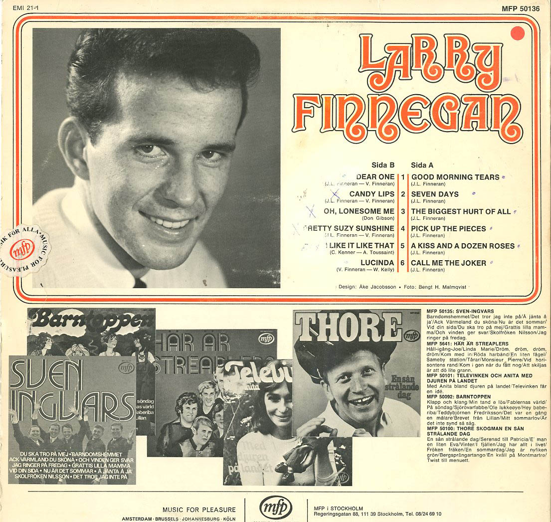 Discographie von Larry Finnegan![]() mfp MFP 50 136 Larry Finnegan Larry Finnegan Eintrag bei DISCOGS (extern) SW 1966, LP, GB-Rock Aufnahme: Mono Zustand: vg+ / vg mit Siegel-Sticker mit Dear One, Candy Lips, Pick Up The Pieces, I Like It Like That u.a. Preis in Euro: 5,00 € Verfügbarkeitsanfrage | ![]() Coveransicht: Larry Finnegan - Larry Finnegan ![]()