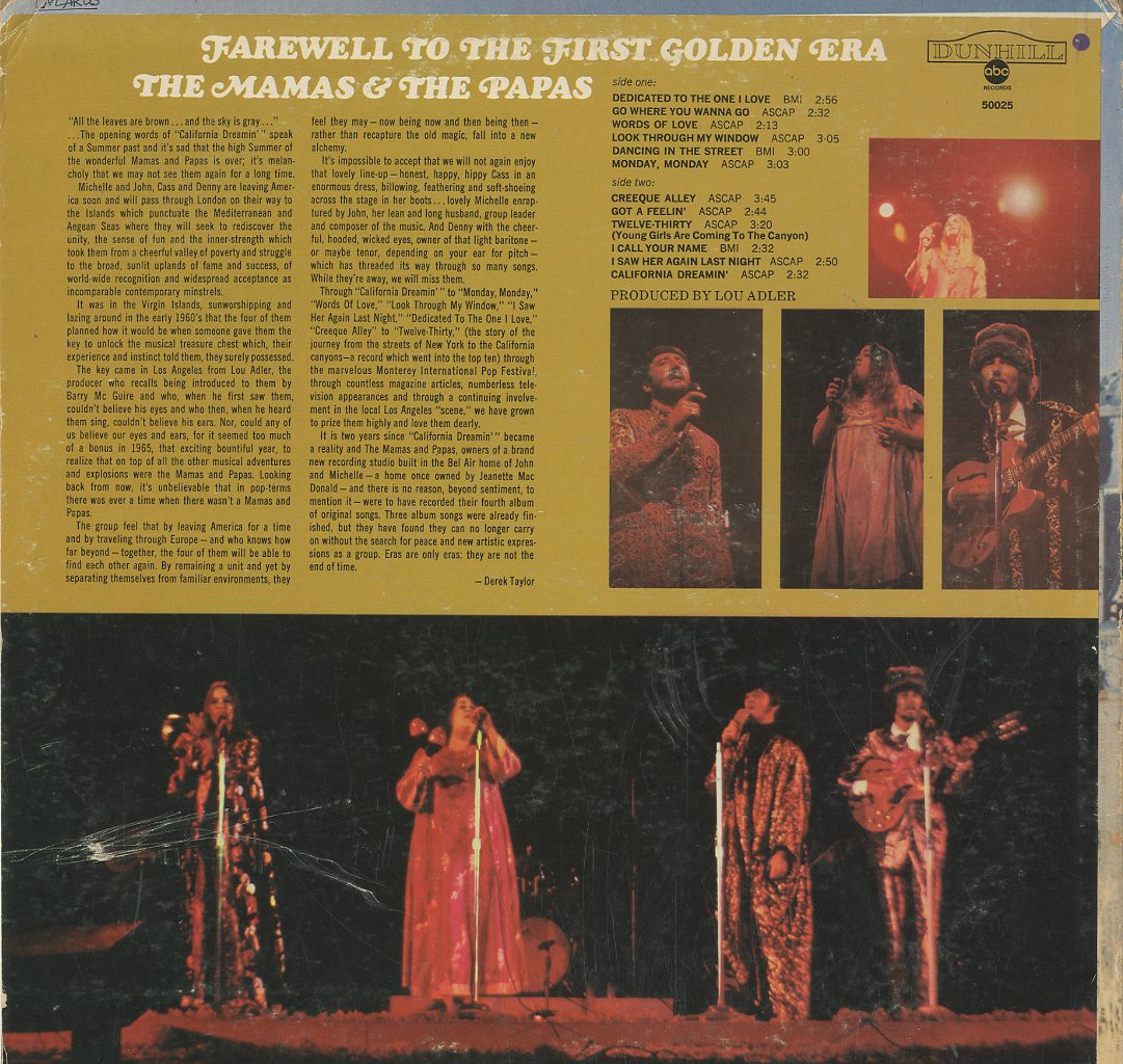 Discographie von The Mamas & The Papas![]() Dunhill DS 50025 The Mamas & The Papas Farewell To The First Golden Era Eintrag bei DISCOGS (extern) US 1966, LP, Pop/Rock Aufnahme: Stereo Zustand: vg / vg(+) mit Dedicated To One I Love, Monday Monday, Creeque Alley u.a. Preis in Euro: 4,50 € Verfügbarkeitsanfrage | ![]() Coveransicht: The Mamas & The Papas - Farewell To The First Golden Era ![]()