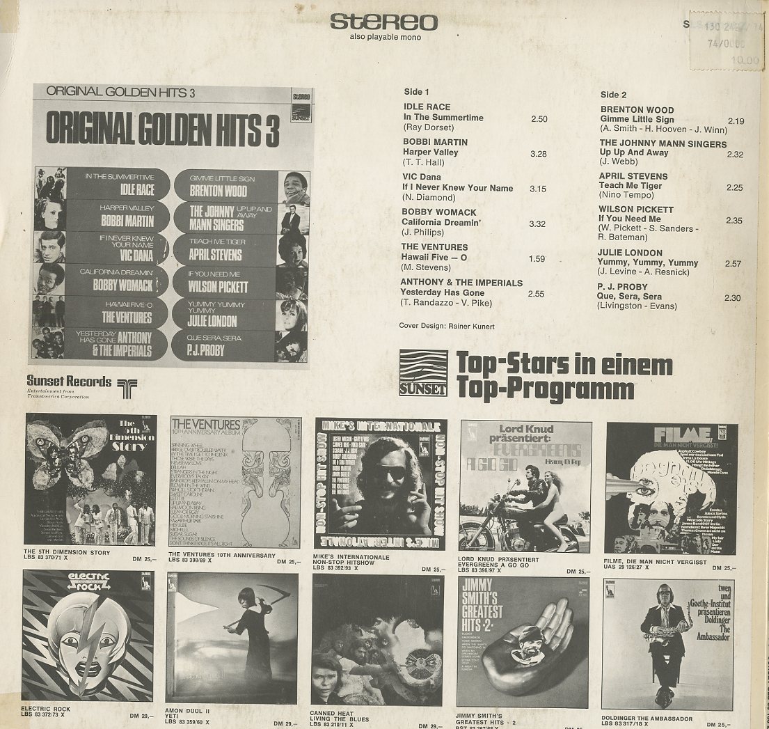 Discographie von Original Golden Hits (Sunset Sampler)![]() Sunset SLS 50 186 Z Original Golden Hits (Sunset Sampler) Original Golden Hits 3 Eintrag bei DISCOGS (extern) D 1969, LP, US-Rock Aufnahme: Stereo Zustand: vg+ bis m- / vg(+) mit Idle Race, Bobby Martin, Vic Dana, Bobby Womack, The Ventures, Anthony & The Imperials, Brenton Wood, The Johnny Mann Singers, April Stevens, Wilson Pickett, Julie London und P.J. Proby Preis in Euro: 4,00 € Verfügbarkeitsanfrage | ![]() Coveransicht: Original Golden Hits (Sunset Sampler) - Original Golden Hits 3 ![]()