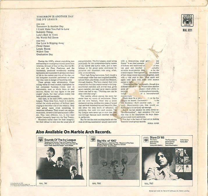 ![]() Marble Arch MAL 821 Ivy League Tomorrow Is Another Day Eintrag bei DISCOGS (extern) UK 1968, LP, GB-Rock Aufnahme: Mono Zustand: vg+ bis m- / vg- (Rücks. besch.s. Foto) sowie Lonely Room, Graduation Day u.a. Preis in Euro: 7,00 € Verfügbarkeitsanfrage | ![]() Coveransicht: Ivy League - Tomorrow Is Another Day ![]()