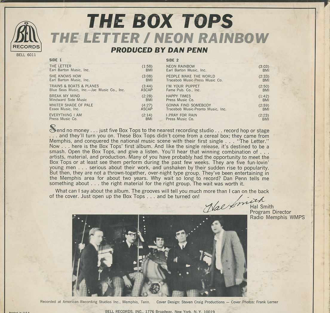 Discographie von The Box Tops![]() bell records BELL 6011 The Box Tops The Letter / Neon Rainbow Eintrag bei DISCOGS (extern) US 1968, LP, Pop/Rock Aufnahme: Mono Zustand: vg+ bis m-/ vg+ Diese Platte ist zur Zeit vergriffen. | ![]() Coveransicht: The Box Tops - The Letter / Neon Rainbow ![]()