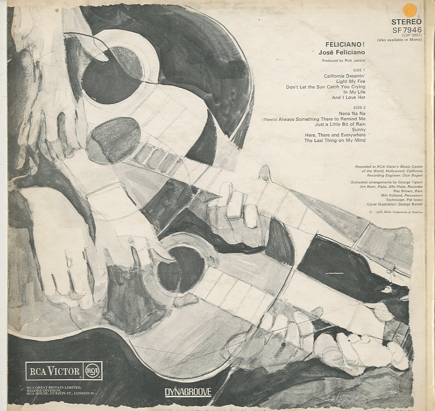 Discographie von Jose Feliciano![]() RCA Victor LSP 3957 Jose Feliciano Feliciano Review der Schallplatte (extern) Eintrag bei DISCOGS (extern) US 1968, LP, Pop/Rock Aufnahme: Stereo Zustand: vg (-) / v g+ u.a. Light My Fire, California Dreamin, Sunny u.a. José Feliciano (g, voc); George Tipton (arr); Ray Brown (b); Jim Horn (fl, rec); Milt Holland (perc); strings and woodwinds Matrix Variante (hier kein R) Preis in Euro: 2.00 € Verfügbarkeitsanfrage | ![]() Coveransicht: Jose Feliciano - Feliciano ![]()