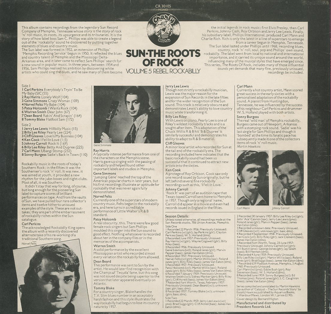 Discographie von SUN Sampler![]() Charly Records CR 30105 SUN Sampler The Roots of Rock, Vol. 5 Rebel Rockabilly Eintrag bei DISCOGS (extern) UK 1976, LP, US-Rock Aufnahme: Mono Zustand: vg+ bis m- / vg+ mit Carl Perkins, Jerry Lee Lewis, Billy Lee Riley, Warren Smith, Sonny Burgess u.a. Diese Platte ist zur Zeit vergriffen. | ![]() Coveransicht: SUN Sampler - The Roots of Rock, Vol. 5 Rebel Rockabilly ![]()