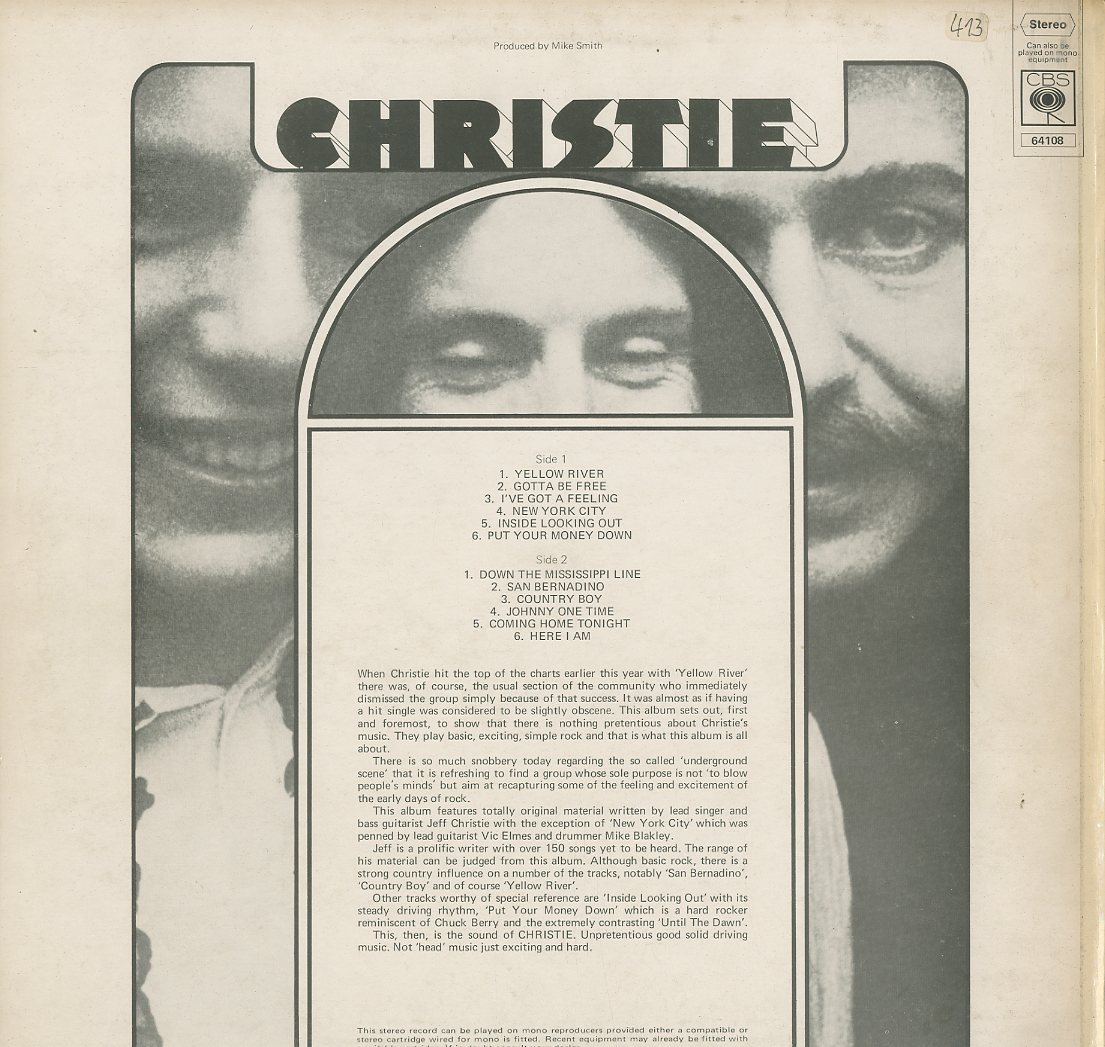 Discographie von Christie![]() CBS S 64 108 Christie Christie - Featuring San Bernadino and Yellow River Eintrag bei DISCOGS (extern) UK 1970, LP, Pop/Rock Aufnahme: Stereo Zustand: vg+ / vg+ Diese Platte ist zur Zeit vergriffen. | ![]() Coveransicht: Christie - Christie - Featuring San Bernadino and Yellow River ![]()