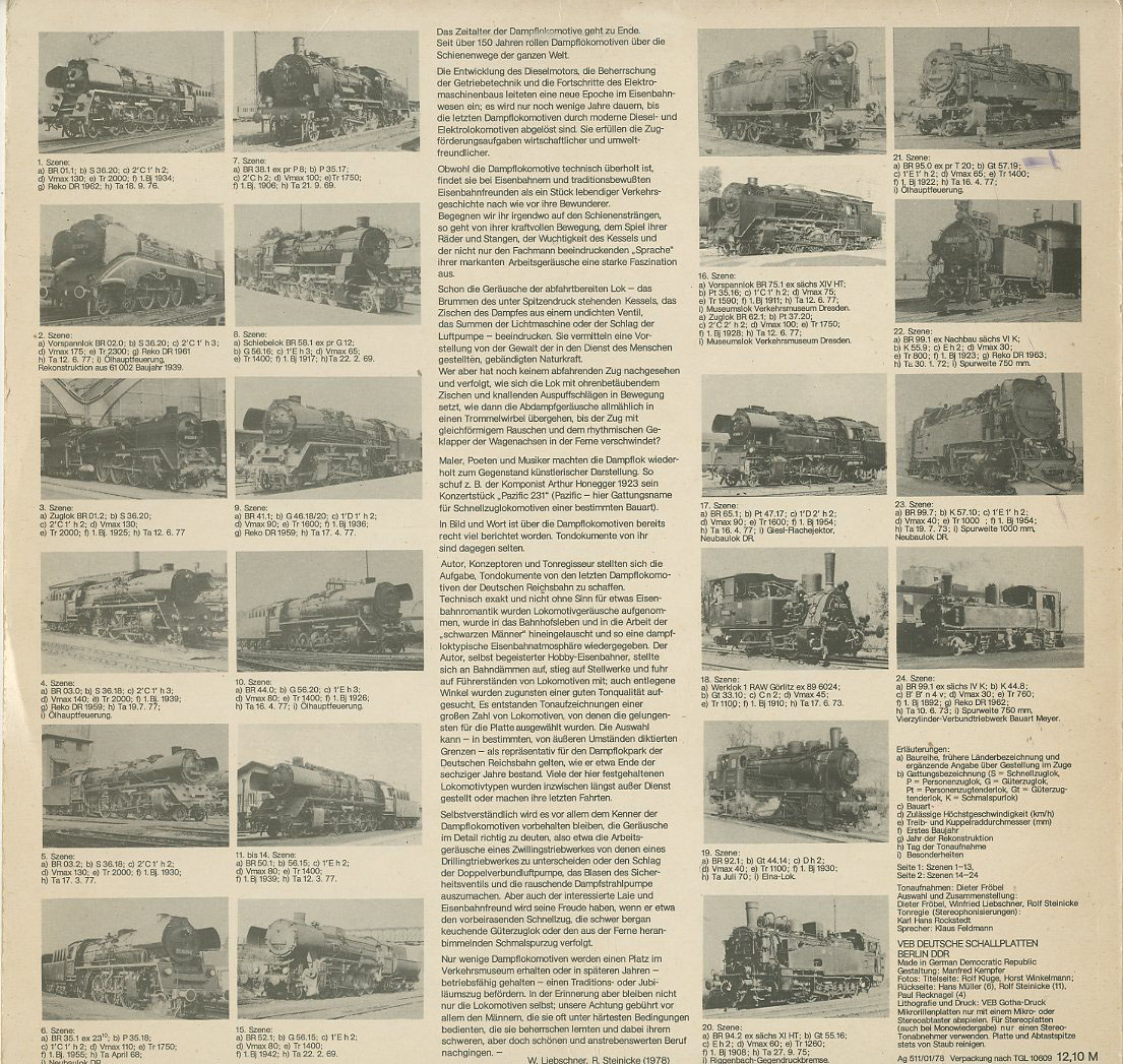 Discographie von Diverse Soundtracks![]() litera 8 65 252 Diverse Soundtracks Von 01 bis 99, Dampflokomotiven der Deutschen Reichsbahn Eintrag bei DISCOGS (extern) DDR 1978, LP, Soundtracks Aufnahme: Mono Zustand: m- / vg Anfahrgeräusche und Signaltöne von 28 Dampflokomotiven mit kurzer Ansage zur Lok, Angaben zu Typ, Baujahr u.a. auf Cover-Rückseite ist bei ebay https://www.ebay.de/itm/225457070674 Preis in Euro: 5,00 € Verfügbarkeitsanfrage | ![]() Coveransicht: Diverse Soundtracks - Von 01 bis 99, Dampflokomotiven der Deutschen Reichsbahn ![]()