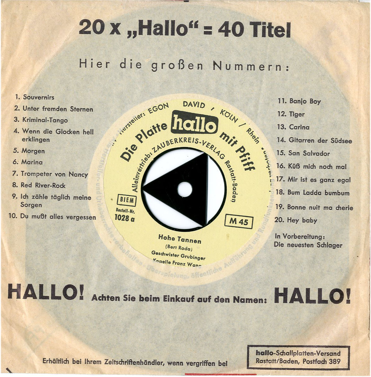 | Discographie von Hallo Flexi-Singles hallo 1032 Hallo Flexi-Singles Hohe Tannen / Drei Boys aus Arkansas D (1960), Single, Deutsche Oldies Aufnahme: Mono Zustand: vg+ S. 1: Geschwister Grubinger, Kapelle Franz Wang S.2: Fred-Hollerbach-Studio-Combo Diese Platte ist zur Zeit vergriffen. | ![]() Coveransicht: Hallo Flexi-Singles - Hohe Tannen / Drei Boys aus Arkansas ![]() |
