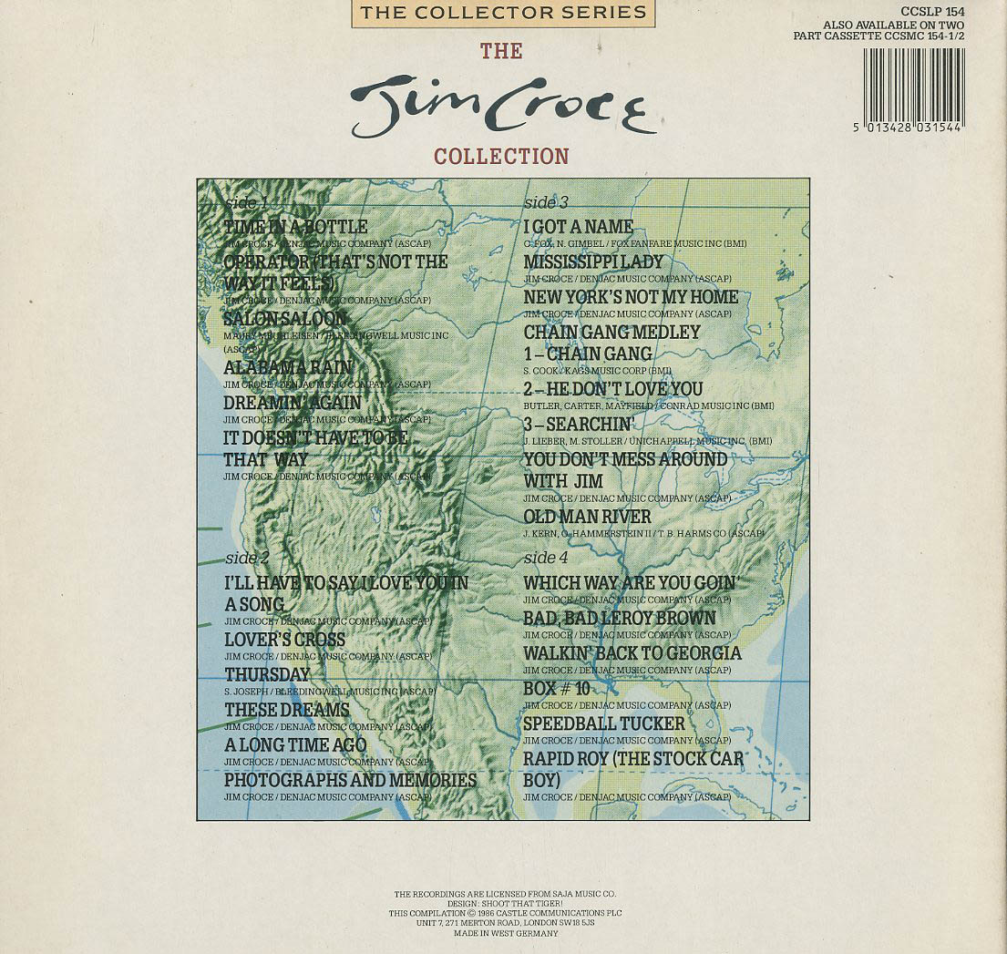 Discographie von Jim Croce The Collector Series CCSLP 154 Jim Croce The Jim Croce Collection (DLP) Eintrag bei DISCOGS (extern) D 1986, LP, C&W/Folk Aufnahme: Stereo Zustand: m- / vg+ mit allen Hits, Old Man River und Chain Gang Medley (Chain Gang, He Will Break Your Heart + Searchin) Diese Platte ist Bestandteil meiner Top 100. Nicht verkäuflich. | ![]() Coveransicht: Jim Croce - The Jim Croce Collection (DLP) ![]()