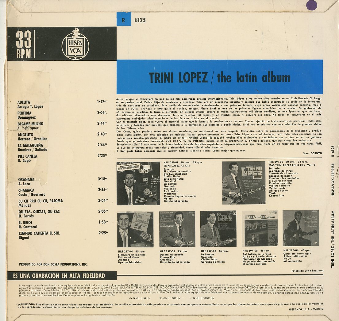 Discographie von Trini Lopez![]() Reprise R 6125 Trini Lopez The Latin Album Eintrag bei DISCOGS (extern) ES 1964, LP, Easy Listening Aufnahme: Stereo Zustand: vg+ / vg (Stereo Sticker vg) mit Adalita; Perfidia ;Besame Mucho, Granada; Cu Cu Rru Cu Cu Paloma; Quizas Quizas Quizas u.a. Preis in Euro: 4,50 € Verfügbarkeitsanfrage | ![]() Coveransicht: Trini Lopez - The Latin Album ![]()