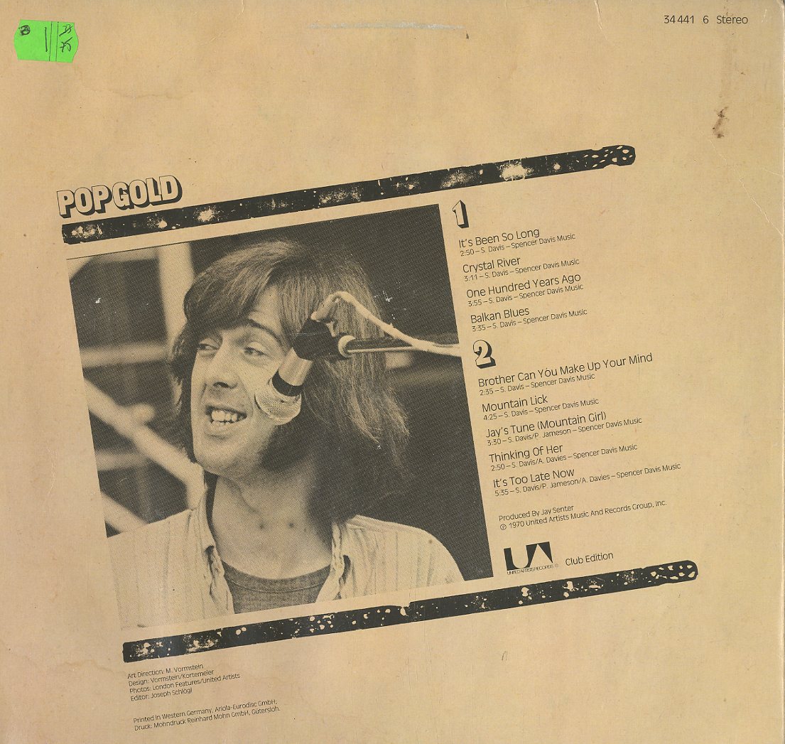 | Discographie von Spencer Davis und Peter Jameson UA 34 441 6 Spencer Davis und Peter Jameson Pop Gold Eintrag bei DISCOGS (extern) D RI 1978 (Orig. 1971), LP, Pop/Rock Aufnahme: Stereo Zustand: vg+ / vg mit Its Been So Long und weitere Eigenkompositionen RI von Its Been So Long (Album) 1971 Preis in Euro: 4,00 € Verfügbarkeitsanfrage | ![]() Coveransicht: Spencer Davis und Peter Jameson - Pop Gold ![]()