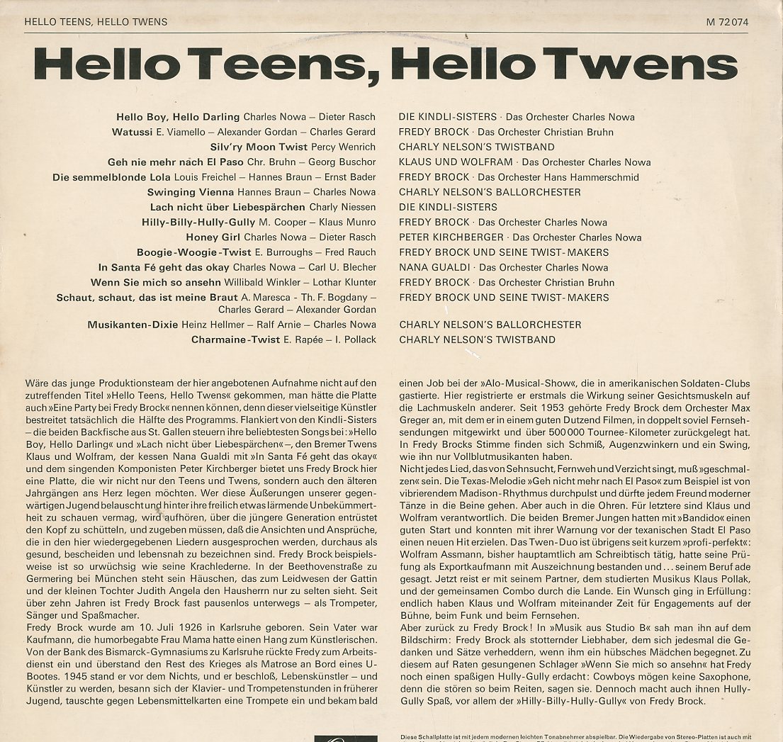 | Discographie von Various GB-Artists Opera M 72074 Various GB-Artists Hello Teens, Hello Twens Eintrag bei DISCOGS (extern) D k.A., LP, GB-Rock Aufnahme: Stereo Zustand: vg+ / v g+ mit Die Kindli-Sisters, Fredy Brock, Charly Nelsons Twistband, Klaus Und Wolfram, Peter Kirchberger sowie Nana Gualdi Diese Platte ist zur Zeit vergriffen. | ![]() Coveransicht: Various GB-Artists - Hello Teens, Hello Twens ![]()