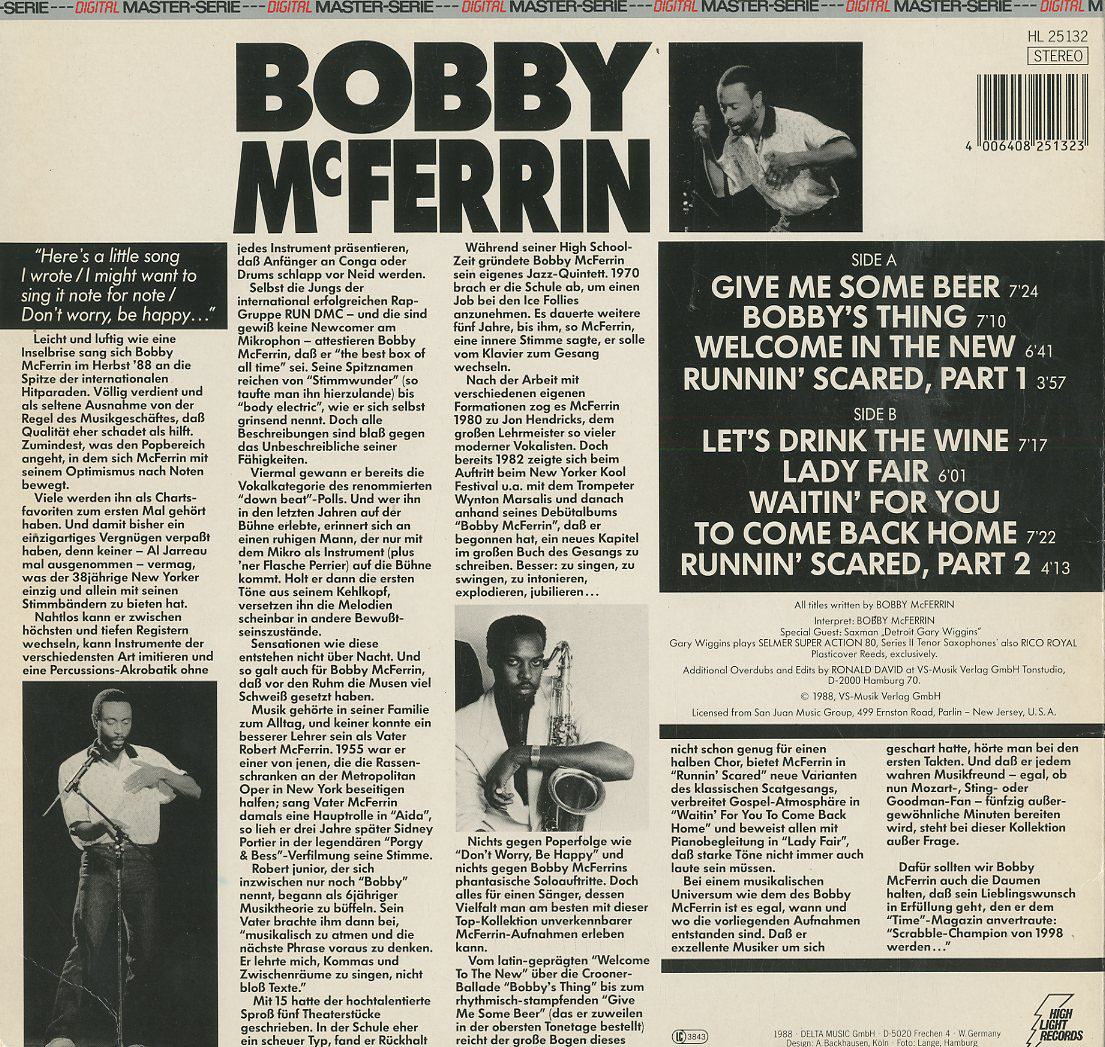 | Discographie von Bobby McFerrin DELTA HL 25 132 Bobby McFerrin Bobbys Thing Eintrag bei DISCOGS (extern) D 1988, LP, Pop/Rock Aufnahme: Stereo Zustand: vg (knistert am Anfang etwas, dann vg+) / nm sowie Give Me Some Beer, Lets Drink The Wine, Lady Fair u.a. Preis in Euro: 5,00 € Verfügbarkeitsanfrage | ![]() Coveransicht: Bobby McFerrin - Bobbys Thing ![]()