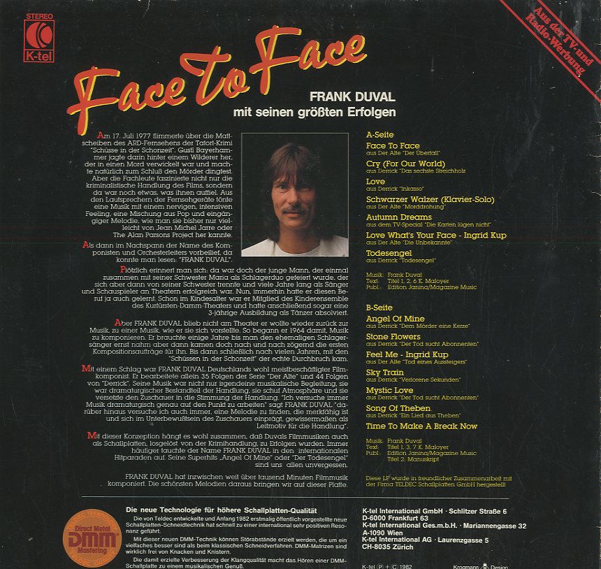 Discographie von Frank (Franco) Duval K-Tel DMM TG 1389 Frank (Franco) Duval Face to Face Eintrag bei DISCOGS (extern) D 1982, LP, Instrumental Aufnahme: Stereo Zustand: m- /. vg+ Frank Duval mit seinen größten Erfolgen, incl. Superhit "Face To Face", Das Beste aus "Derrick" und "Der Alte" Preis in Euro: 4,50 € Verfügbarkeitsanfrage | ![]() Coveransicht: Frank (Franco) Duval - Face to Face ![]()