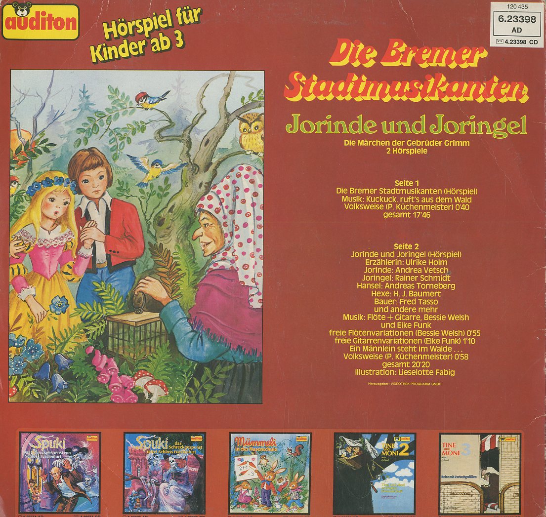 | Discographie von Grimms Märchen audition 6.23398 AD Grimms Märchen Die Bremer Stadtmusikanten / Jorinde und Joringel D 1978, LP, Soundtracks Aufnahme: Stereo Zustand: vg+ / vg+ mit Musik, u.a. Kuckuck Kuckuck und Ein Männlein stehtim Walde Nicht gelistet Preis in Euro: 4,00 € Verfügbarkeitsanfrage | ![]() Coveransicht: Grimms Märchen - Die Bremer Stadtmusikanten / Jorinde und Joringel |