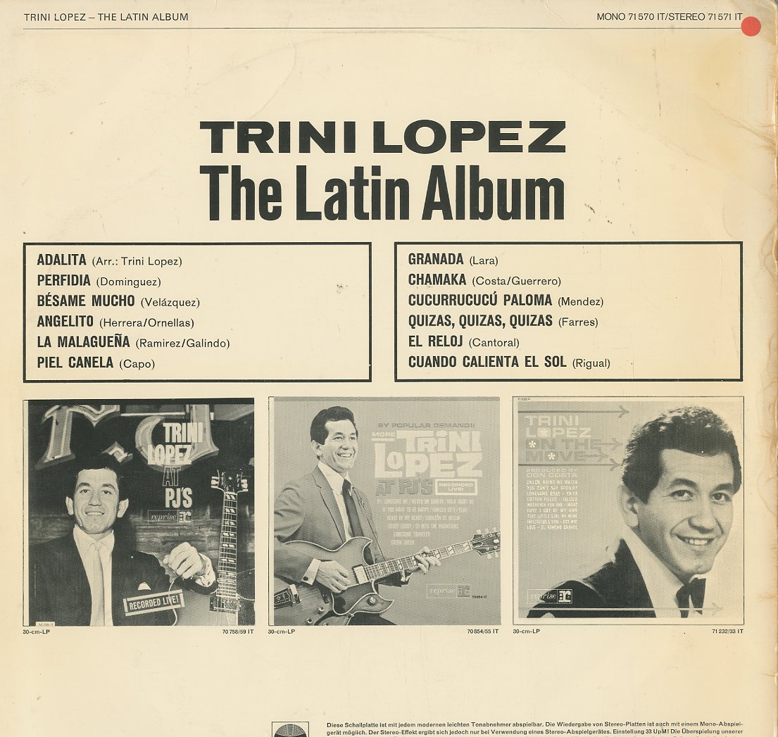 | Discographie von Trini Lopez Reprise Ariola 71570 IT Trini Lopez The Latin Album Eintrag bei DISCOGS (extern) D 1964, LP, Easy Listening Aufnahme: Mono Zustand: vg+ / vg mit Perfidia; Besame Mucho; La Malaguena; Cu Cu Rru Cu Cu Paloma; Quizas Quizas Quizas u.a. Preis in Euro: 4,50 € Verfügbarkeitsanfrage | ![]() Coveransicht: Trini Lopez - The Latin Album ![]()