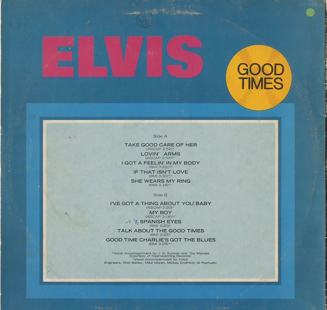 Discographie von Elvis Presley![]() RCA Victor CPL 1 0475 Elvis Presley Good Times Eintrag bei DISCOGS (extern) IT 1974, LP, US-Rock Aufnahme: Stereo Zustand: vg (-) / vg (-) u.a. mit Spanish Eyes Preis in Euro: 2,50 € Verfügbarkeitsanfrage | ![]() Coveransicht: Elvis Presley - Good Times ![]()
