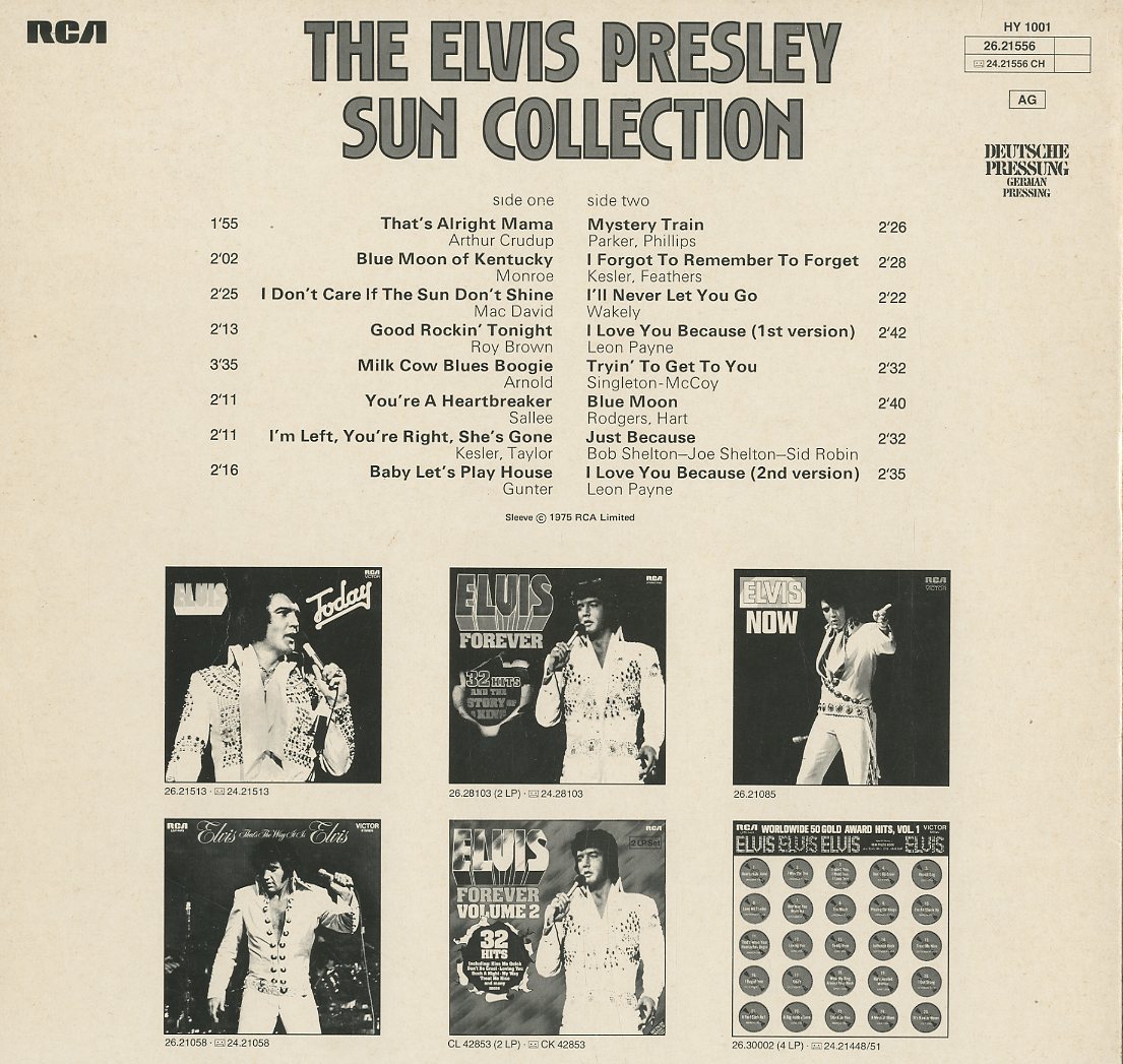 Discographie von Elvis Presley![]() RCA International HY 1001 (26.21556) Elvis Presley The Elvis Presley Sun Collection Eintrag bei DISCOGS (extern) D 1975, LP, US-Rock Aufnahme: Mono Zustand: vg+ / vg+ His First Recordungdm it Thats All Right Mama, Blue Moon Of Kentucky, Good Rockin Tonight, Milk Cow Blues Boogie u.a, Teilw. auf EP Good Rockin Tonight (1958) Matrix Variant , kein Man. in Germany Preis in Euro: 5,00 € Verfügbarkeitsanfrage | ![]() Coveransicht: Elvis Presley - The Elvis Presley Sun Collection ![]()